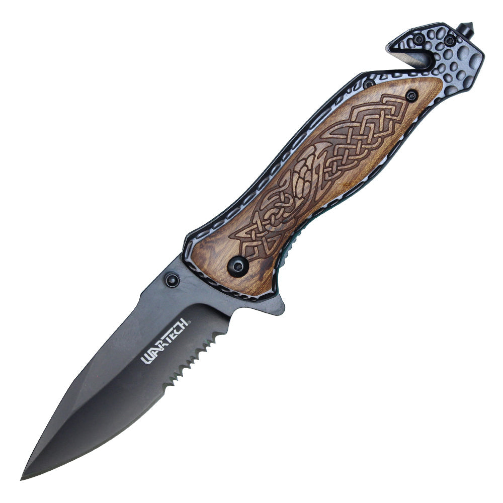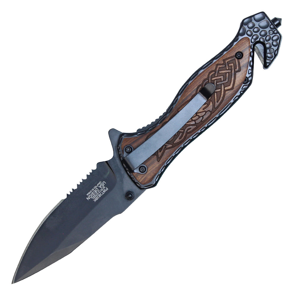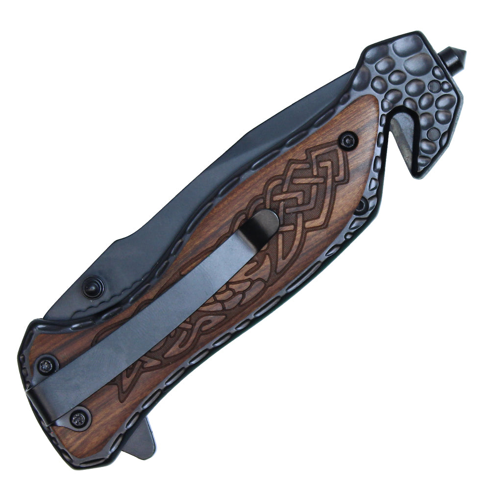 8" Black Stainless Steel Assisted Pocket Knife w/ Celtic Patterned Handle & Serrated Edge