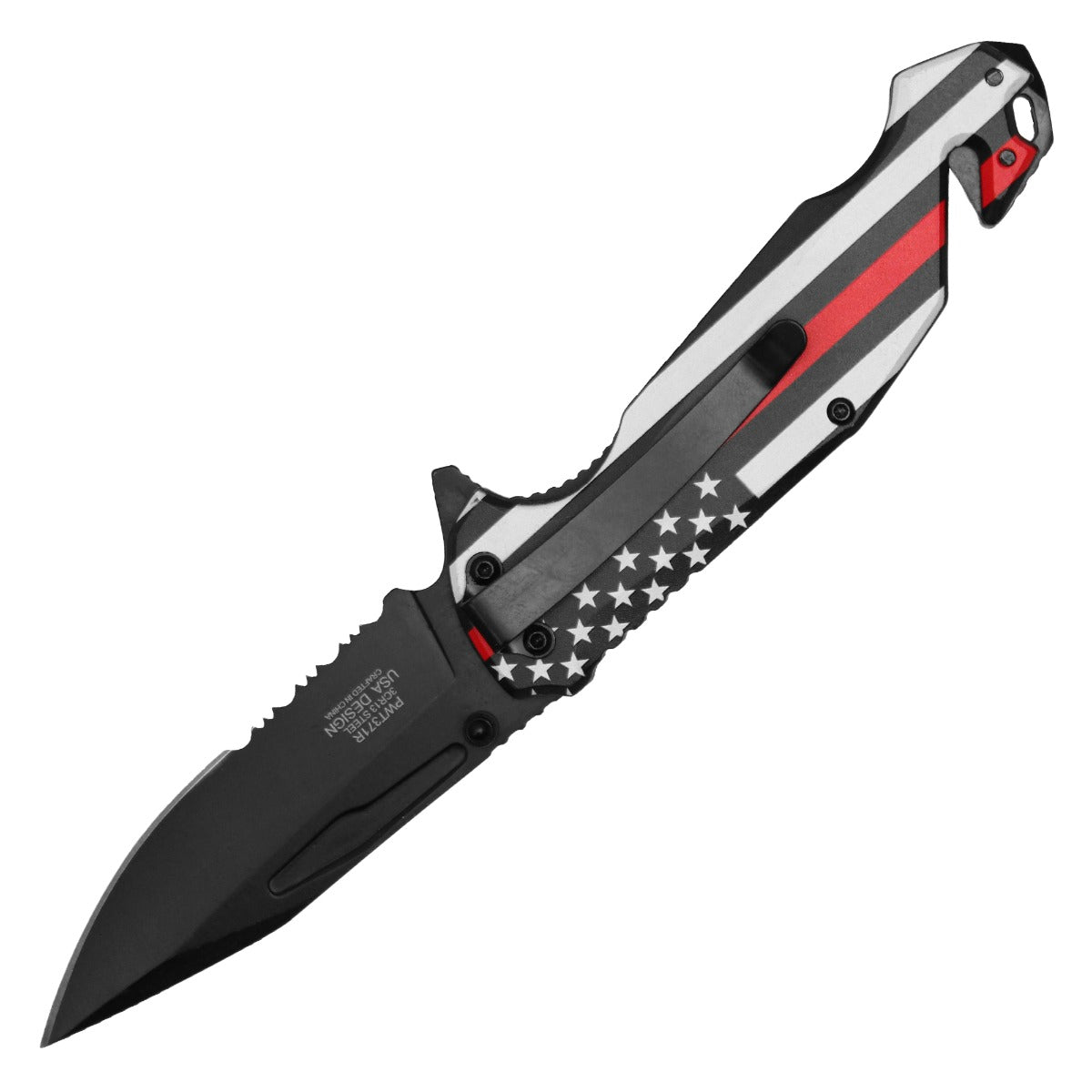 Show your support for the brave firefighters who serve with the Wartech 8.25" Thin Red Line Spring Assisted Pocket Knife. Featuring a 3.5" partially serrated black steel blade, this knife provides both cutting precision and the ability to tackle tough materials. The 4.75" Thin Red Line American flag print handle not only represents the firefighting community but also provides a sturdy grip. Outfitted with a cord cutter and lanyard hole, this knife is built for emergencies, making it a trusted tool in high-pressure situations. A tribute to the heroes, it's both functional and meaningful.