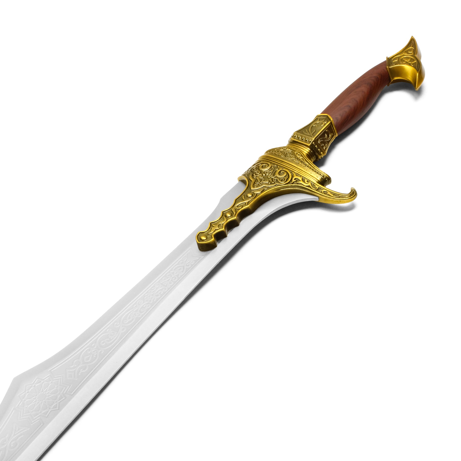 Wield the power of an Assassin with the Initiate of Alamut Sword, a remarkable replica from Assassin's Creed Mirage. This intricately detailed sword mirrors the legendary weapon of the Assassin's Order, with its golden decorations and engraved blade symbolizing the Brotherhood’s enduring legacy. Whether you're a cosplayer looking for an authentic addition to your gear or a collector who wants to own a piece of Assassin's Creed history, this sword is the perfect centerpiece for display. The Initiate of Alamut Sword features an engraved stainless steel blade and a decorated brown and gold handle, delivering an iconic weapon that fans will love. This sword comes complete with a sleek black leather sheath, ready for combat or display.