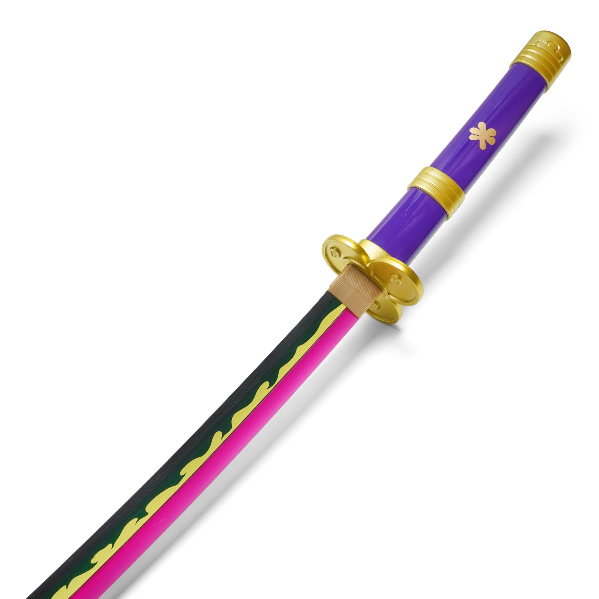 Unleash the legendary power of Enma, the fearsome blade wielded by Roronoa Zoro in One Piece, now reimagined with a brilliant magenta LED glow. This 38.5” replica features a 27” glowing plastic blade, illuminating Enma’s iconic wavy hamon pattern in striking detail. The 11.5” purple and gold handle stays true to the anime’s design, while the sleek purple scabbard with gold accents and a red tassel completes the majestic look of this legendary sword. Known as one of the only swords capable of injuring Kaido, Enma is a blade of immense power and precision. Perfect for cosplay, display, or adding a dazzling presence to any One Piece collection, this LED-powered Enma replica is a must-have for devoted fans of Zoro’s evolving arsenal.