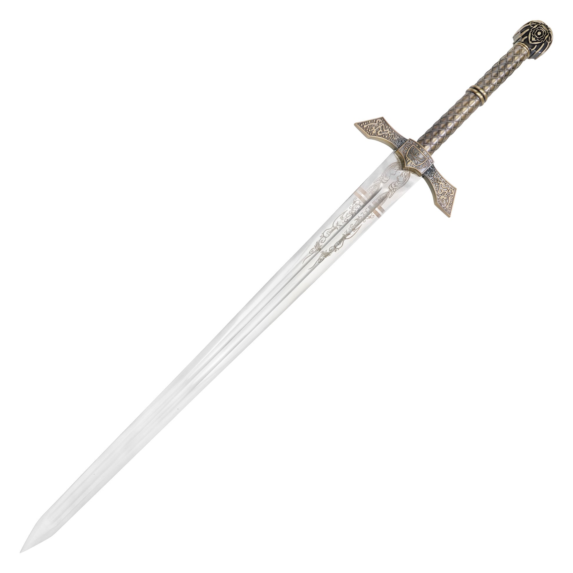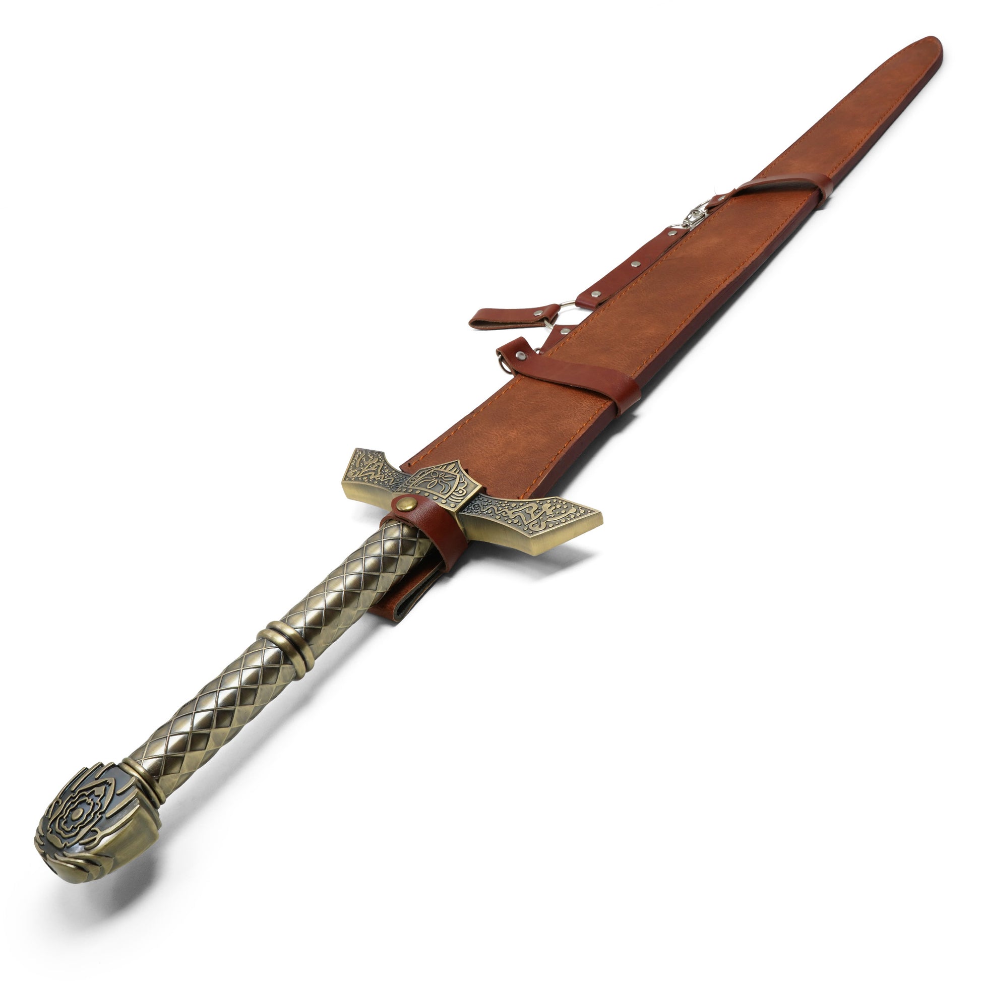 Bring the unwavering resolve of the Banished Knights to your collection with this Banished Knight’s Greatsword, a beautifully crafted replica from Elden Ring. Measuring 42.25” in overall length, this two-handed blade features a 31” etched stainless steel blade engraved with swirling motifs that echo the solemn honor and strength of the knights exiled from the royal order. The 11.25” detailed metal handle showcases a crosshatch grip and ornate crossguard, evoking the weathered grandeur of a once-loyal warrior. This full-size steel replica includes a strapped faux leather sheath for display or cosplay, making it a perfect centerpiece for fans of the game’s dark fantasy lore. Ideal for collectors seeking to embody the tragic nobility and power of one of Elden Ring’s most iconic knight classes.