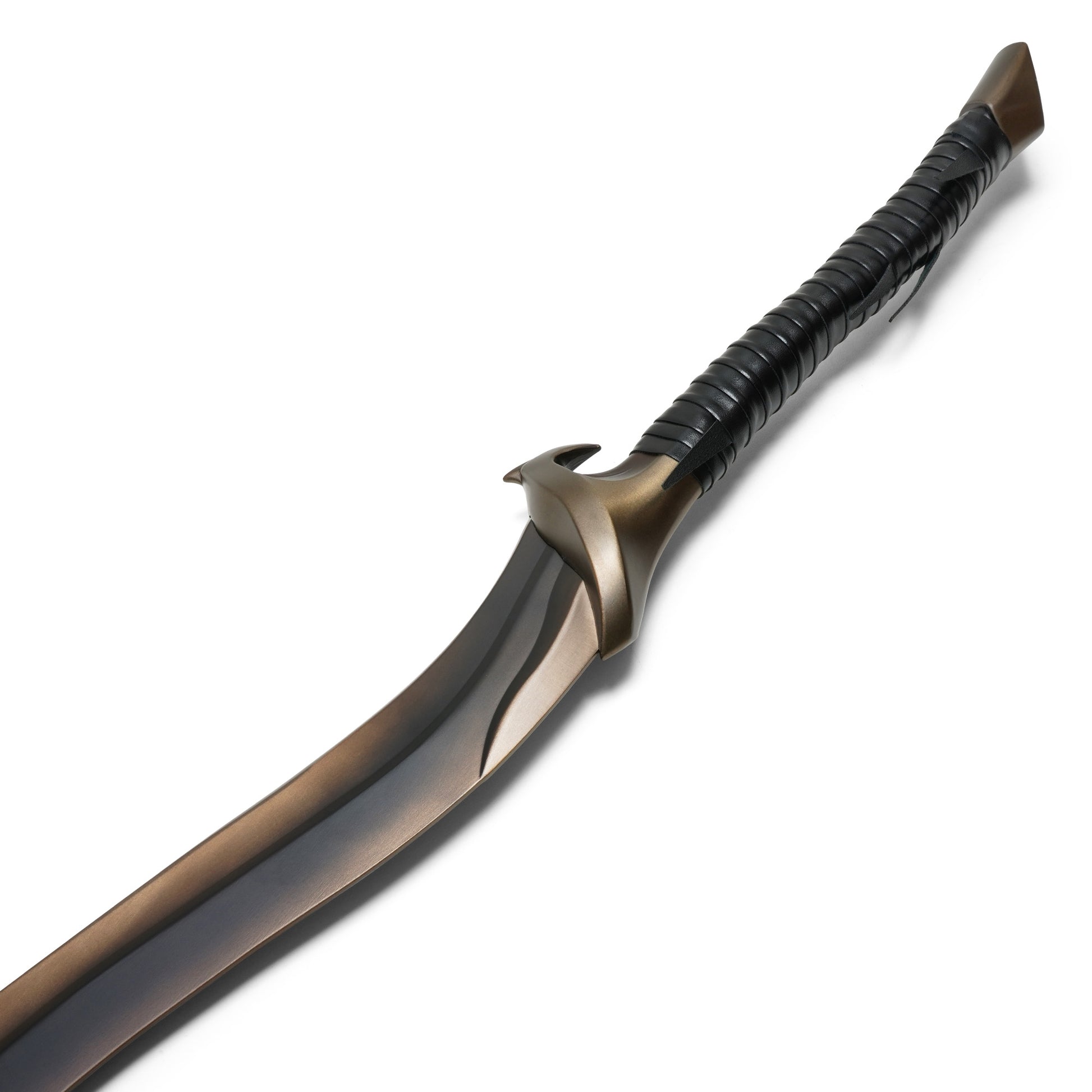 Wield the legendary Bloodhound’s Fang Greatsword, a fan-favorite weapon from Elden Ring, known for its distinctive curved design and swift, devastating strikes. This replica perfectly captures the elegance and ferocity of the in-game greatsword with its imposing 34-inch curved metal blade, finished in a dark bronze tone for an authentic aged look. The 12.25-inch handle is wrapped in black for a firm and stylish grip, true to its original design. Complete with a wooden display plaque, this greatsword is ideal for cosplay, collection, or display, embodying the mystique and danger of the Lands Between. A must-have for any Elden Ring fan looking to own a piece of this iconic adventure.