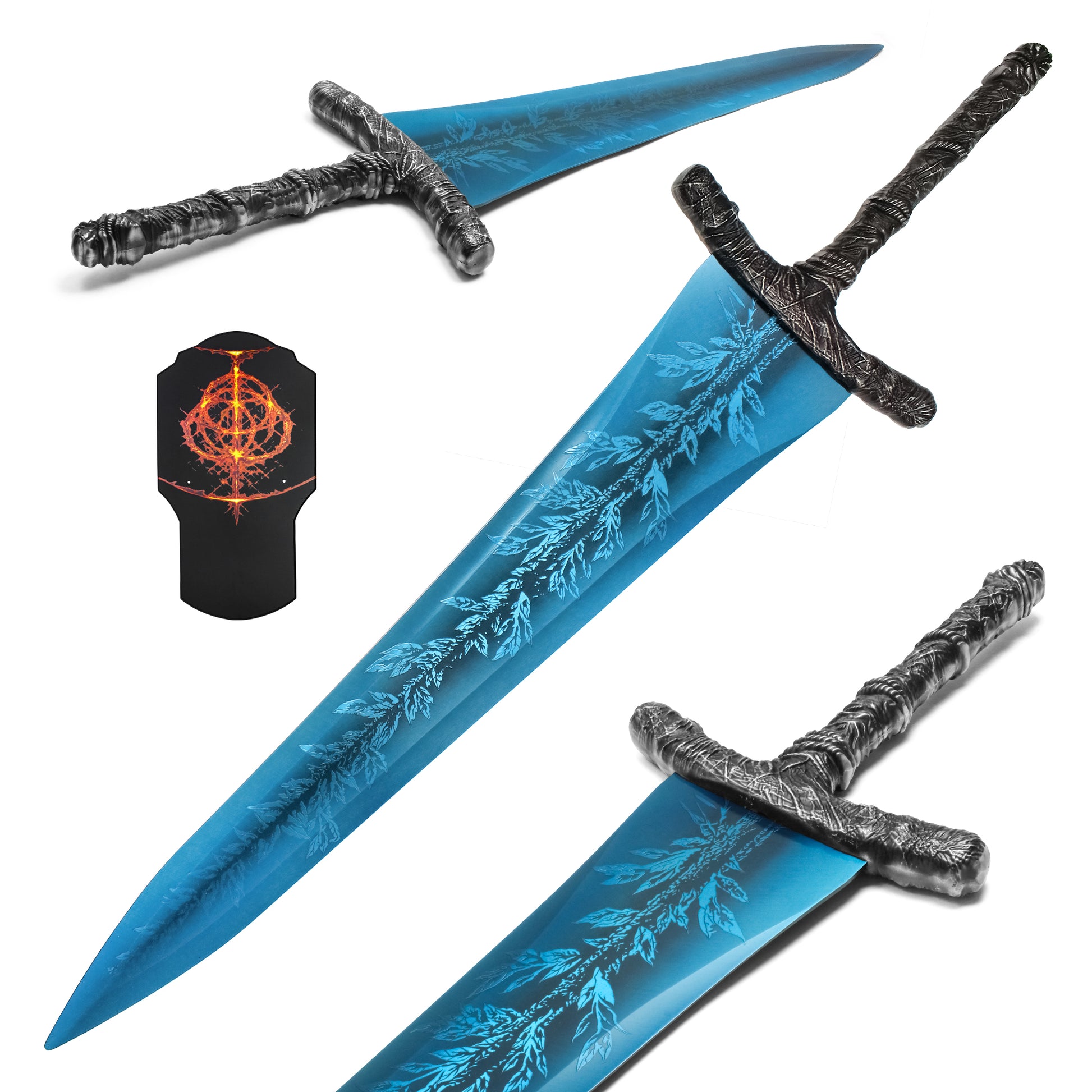 Unleash the power of the stars with the Dark Moon Greatsword, a stunning steel replica from Elden Ring, perfect for cosplay, collection, or display. This finely crafted sword features a 35-inch engraved blue steel blade, echoing the ethereal beauty of the game's iconic weapon. The intricate stone-like gray handle offers a firm yet comfortable grip at 12.75 inches in length, making it ideal for wielding in cosplay or displaying as a centerpiece. Complete with a wood display plaque, this replica will captivate any Elden Ring fan with its attention to detail and faithful representation of the in-game weapon.