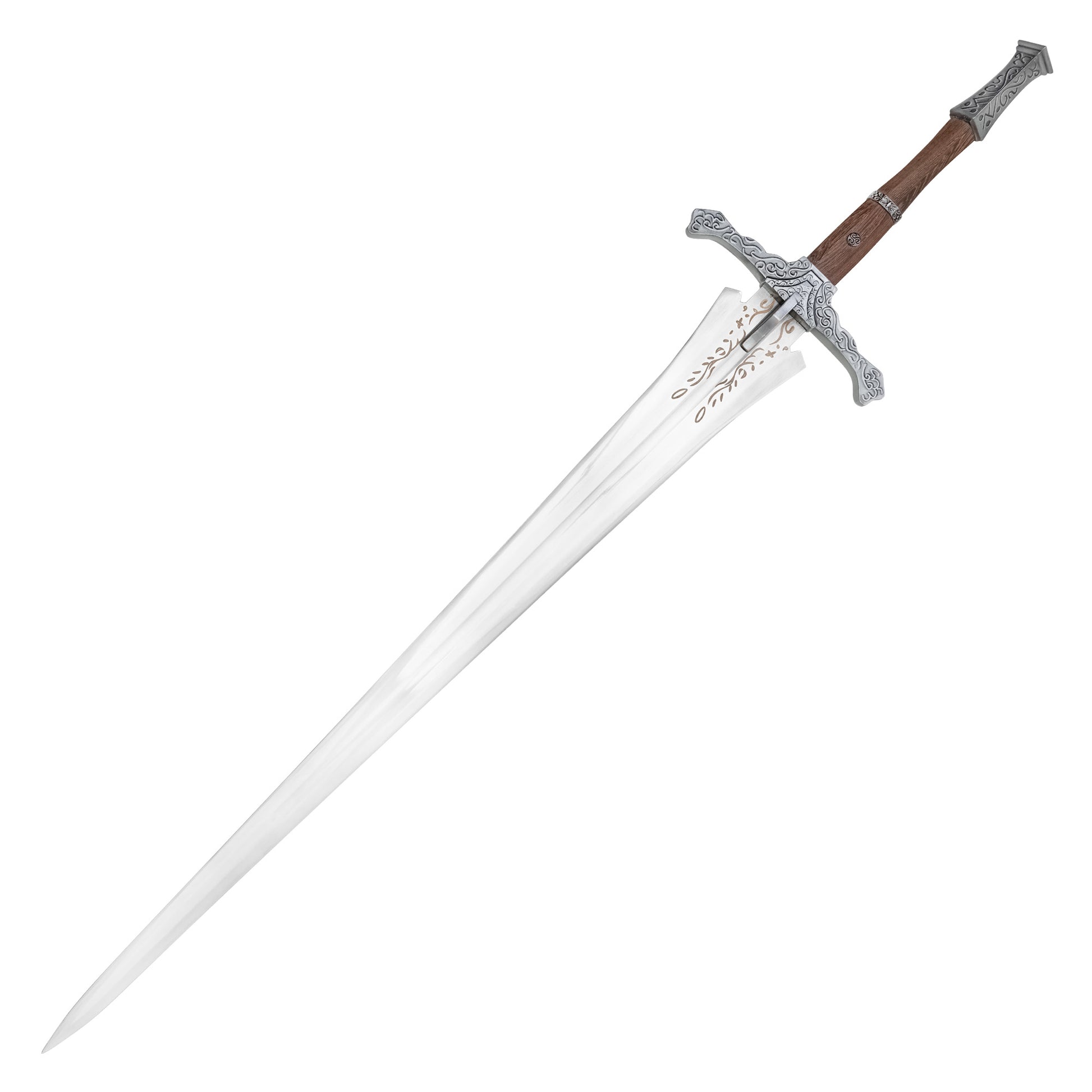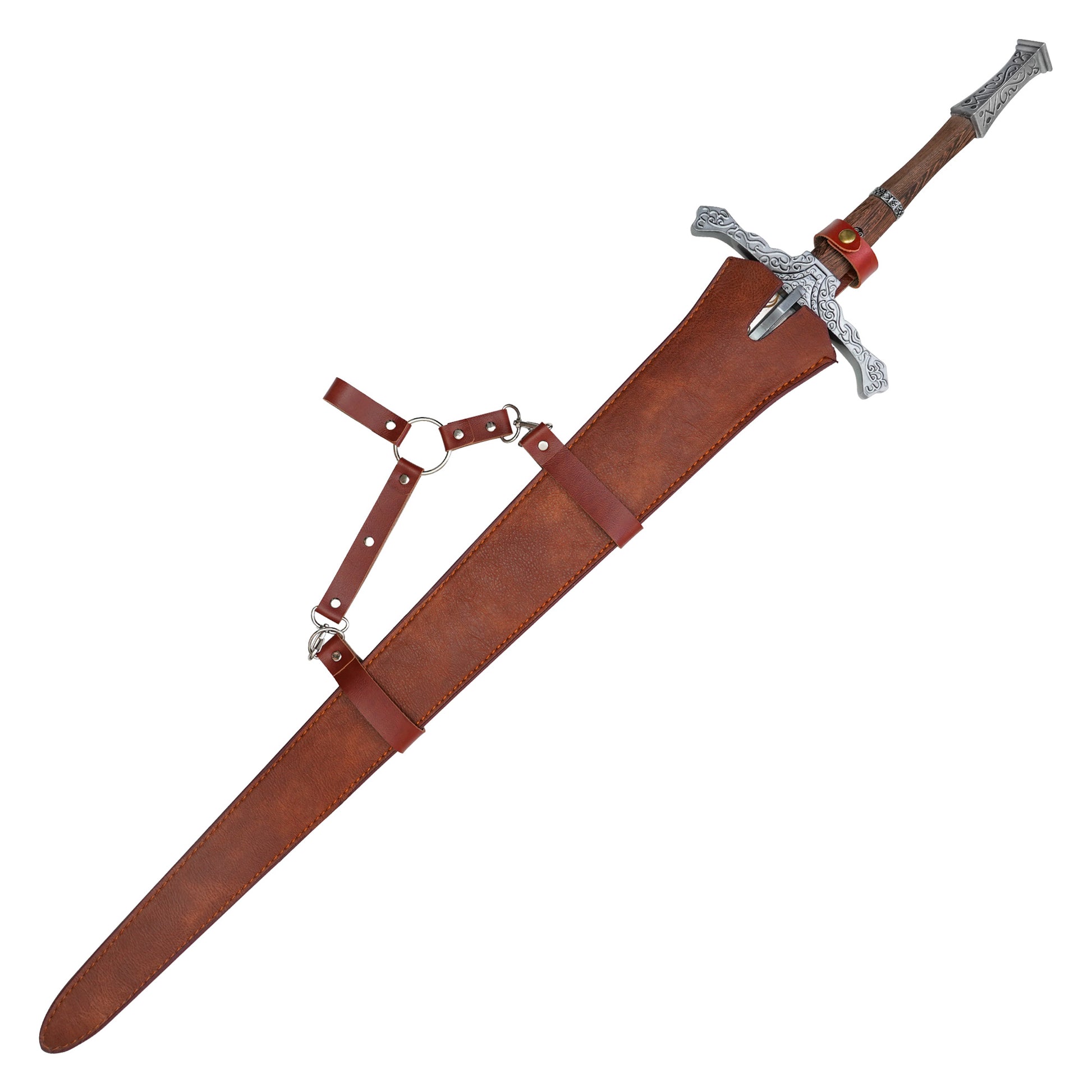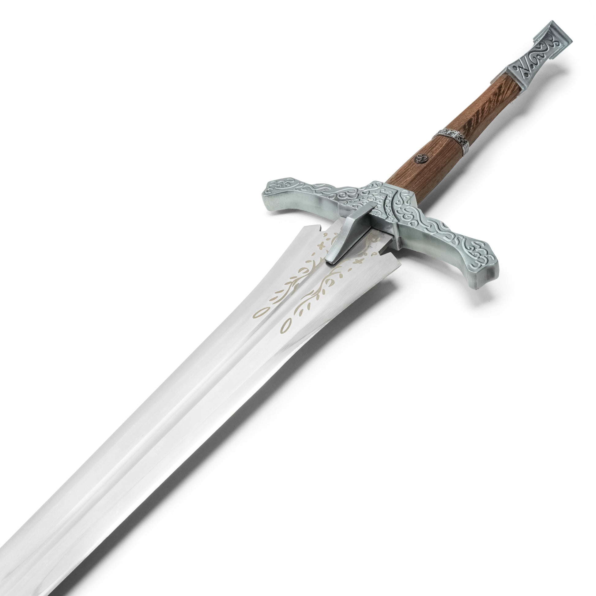 Channel the valor of the Lands Between with the Knight’s Greatsword, a faithful replica inspired by the elegant yet deadly blades wielded by elite warriors in Elden Ring. This 42” collectible sword features a polished 31” stainless steel blade engraved with ornate golden runes and patterns reminiscent of the game’s divine lore. The 11” handle combines a smooth brown wood grip with silver-toned metal accents, offering a sturdy feel and regal appearance. Ideal for cosplay or display, the sword comes with a strapped faux leather sheath designed for secure carrying or hanging in your armory. With its balance of beauty and strength, this greatsword captures the noble spirit of the Tarnished and stands as a must-have for Elden Ring collectors and fantasy sword enthusiasts.