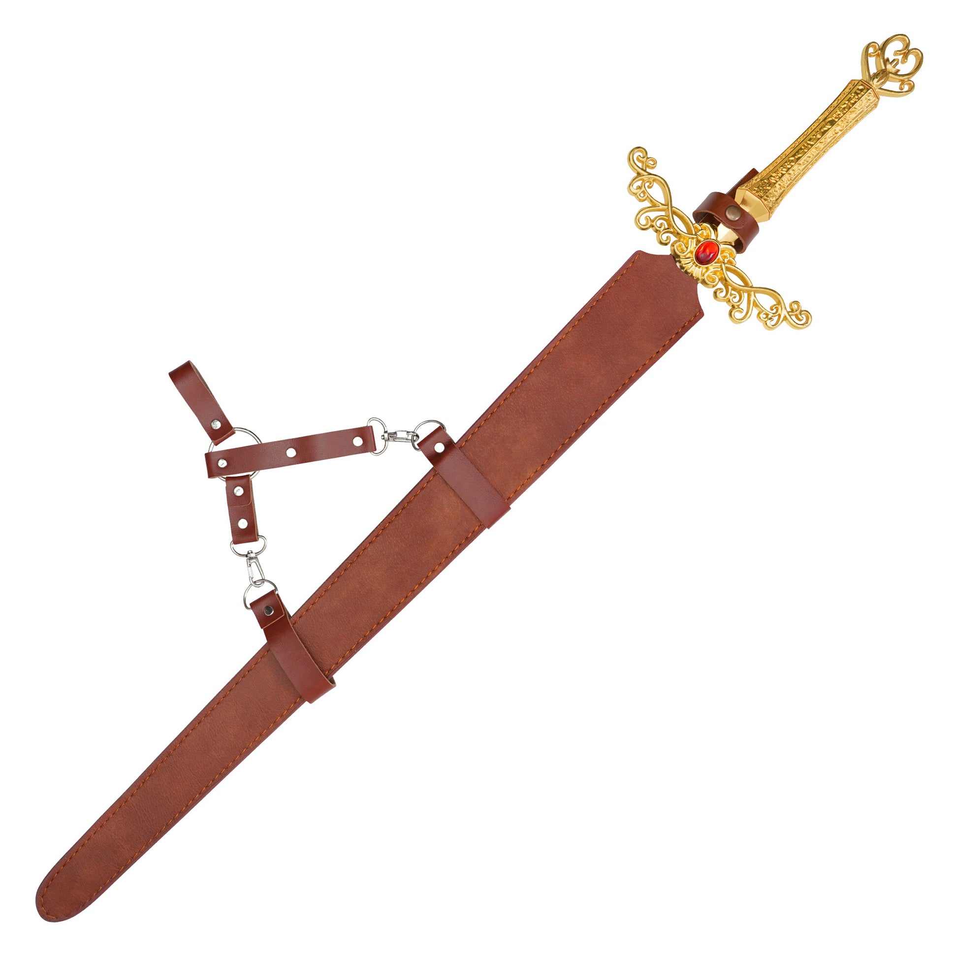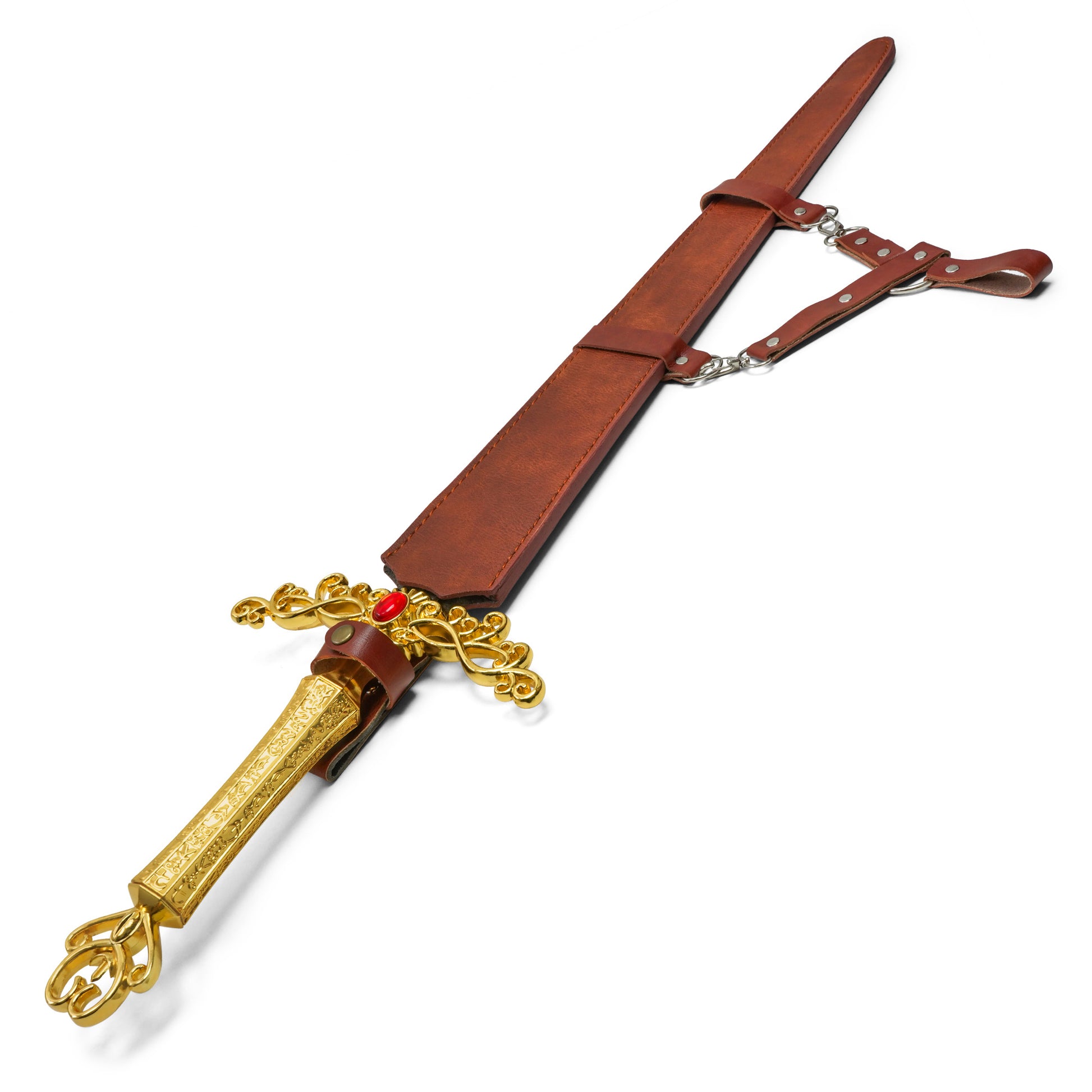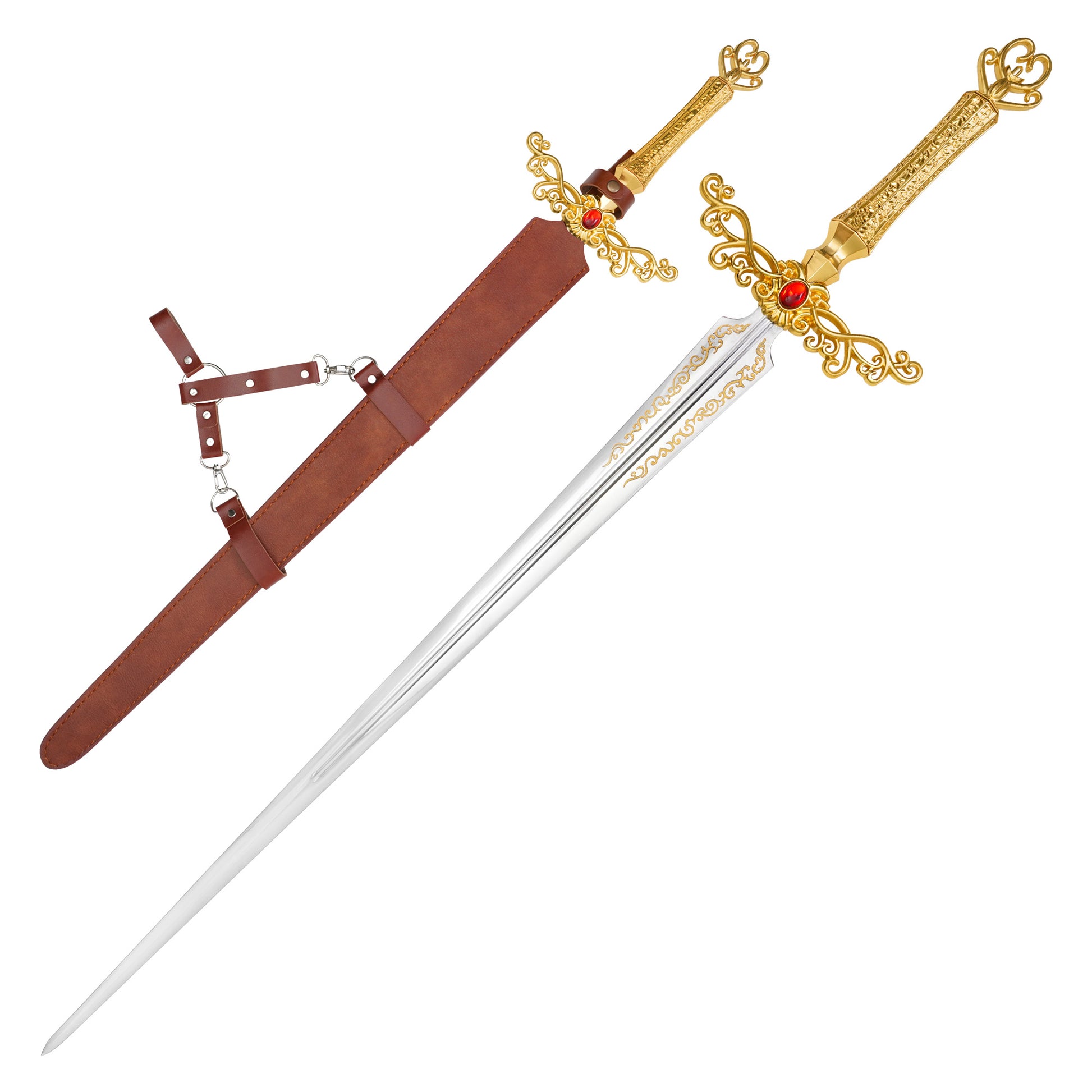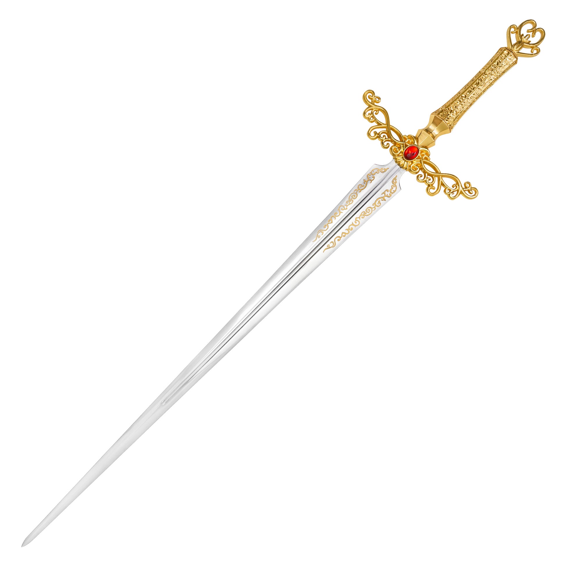 Channel the refined arcane mastery of the sorcerer-turned-knight with Rogier’s Rapier, a dazzling replica from Elden Ring crafted for fans and collectors alike. Measuring 37” in overall length, this elegant blade features a 27.25” etched stainless steel blade detailed with golden scrollwork, capturing the grace and mysticism of the original weapon. The 9.75” ornate gold handle, adorned with an embedded crimson jewel, reflects the noble aesthetic of Rogier himself—a learned spellblade who sought truth deep within the lands of the Erdtree. Ideal for cosplay, display, or as a conversation-starting centerpiece, this officially inspired steel replica includes a strapped faux leather sheath for safe transport and classic wall mounting.