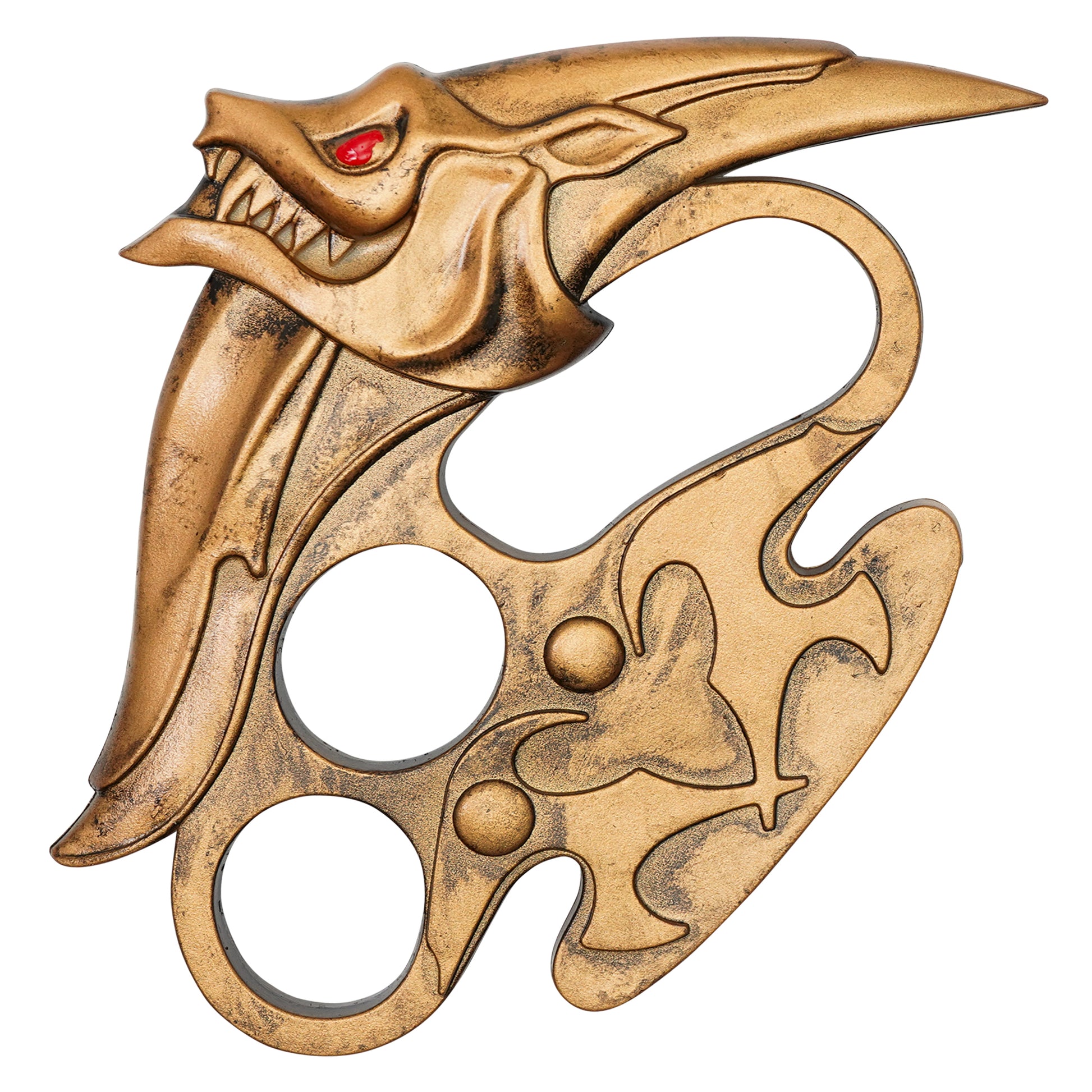 Step into the pit with Sett’s Brass Knuckles, a 2-piece replica set inspired by the Boss himself from League of Legends. Known for his brutal takedowns and bare-knuckle brawling style, Sett delivers knockout justice with these signature gauntlets. This collector’s set includes a 5" x 3" left-hand knuckle and a 5.75" x 4.25" right-hand knuckle, crafted from lightweight plastic with a distressed gold finish that mimics weathered metal. The right knuckle showcases Sett’s signature beast-like motif with a sculpted face and crimson eye detail, making this set ideal for cosplay, themed displays, or League of Legends collections. Rugged in style but safe for fan use, these knuckles pack a visual punch worthy of the Ionian underground.