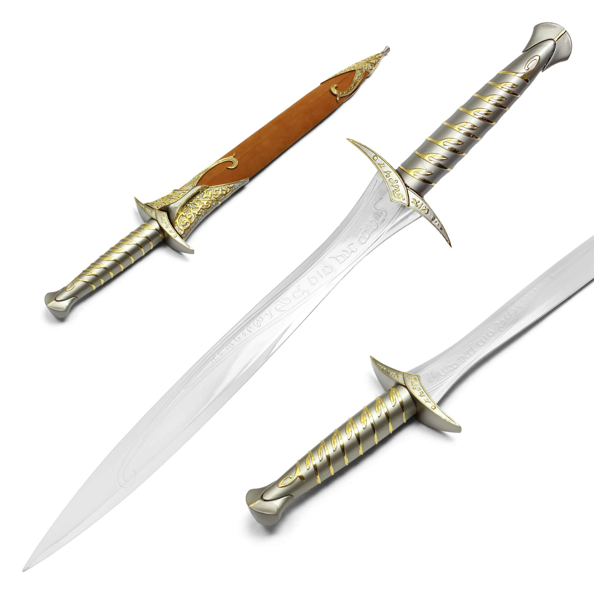 Wield the power of Middle-earth with the Sting Sword, an exact replica inspired by Lord of the Rings. This iconic blade was used by Bilbo and later Frodo Baggins during their journey to destroy the One Ring. Known for its glowing blade when Orcs are near, the Sting sword became a symbol of courage and bravery. This replica features a beautifully crafted 17" silver metal blade adorned with Elvish engravings and a 6.5" silver and gold handle that showcases elegant craftsmanship. Complete with a bronze and gold scabbard, this Sting Sword is perfect for collectors, cosplayers, or fans looking to own a piece of the Lord of the Rings legend. Display it proudly as a centerpiece or take it to your next cosplay event to embody the spirit of the Shire!