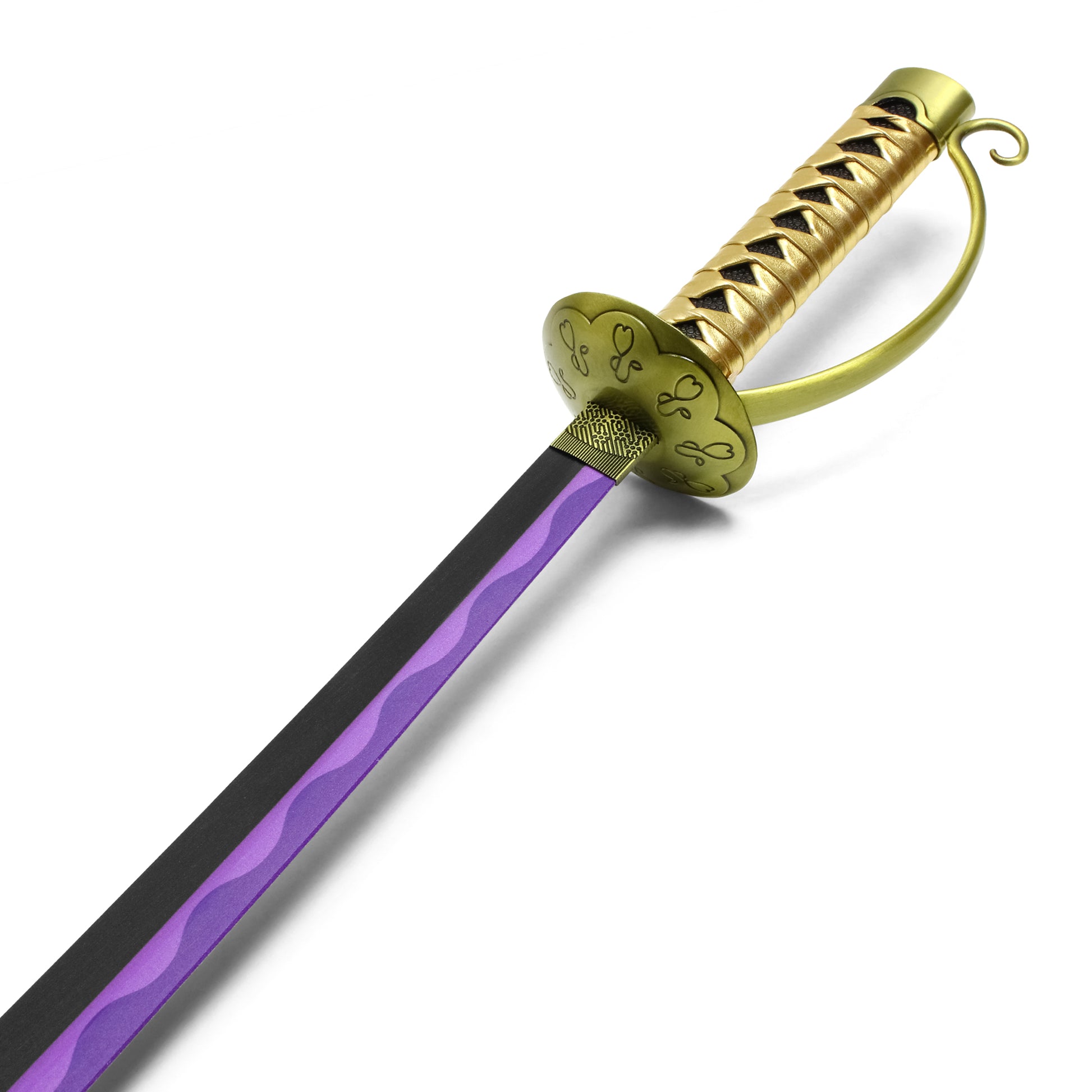 Wield the legendary power of Gol D. Roger with this stunning replica of "Ace," the cutlass sword from the iconic anime and manga One Piece. Known as the Pirate King, Roger was a figure of unmatched strength, and his trusted sword "Ace" played a vital role in his rise to fame. This 34" collectible sword features a 26.5" black and purple steel blade with a distinct wave pattern, paying homage to the sword's design in the series. The 7.5" gold handle is carefully crafted with black accents, mirroring the one seen in One Piece. Complete with a sleek leather sheath, this steel replica is perfect for cosplay, collection, or display, offering an authentic piece of Roger's legacy to fans.