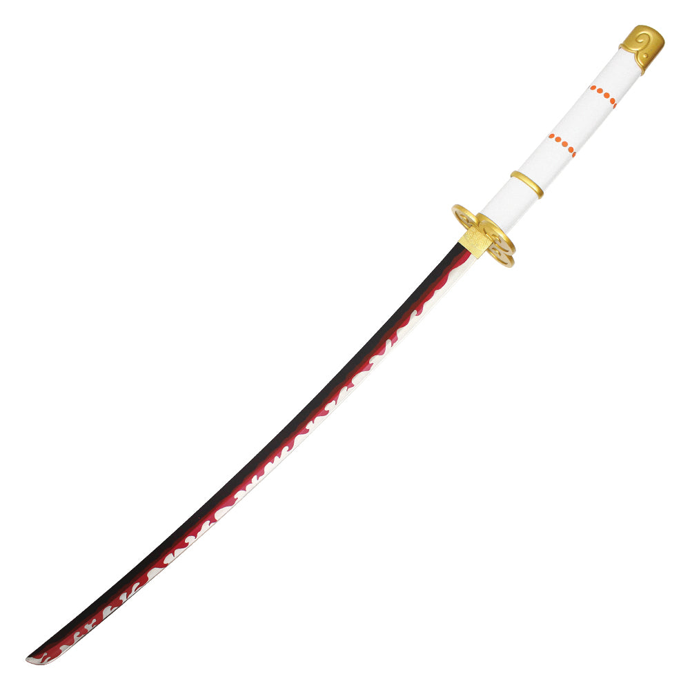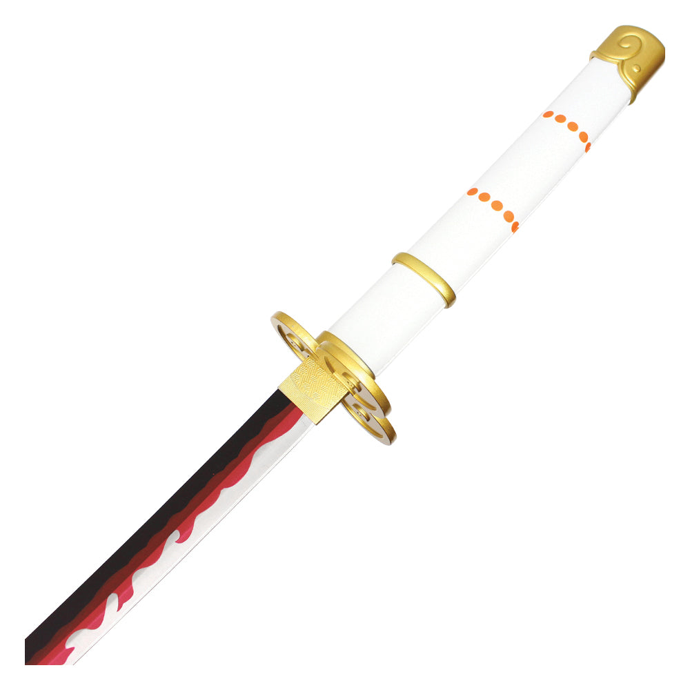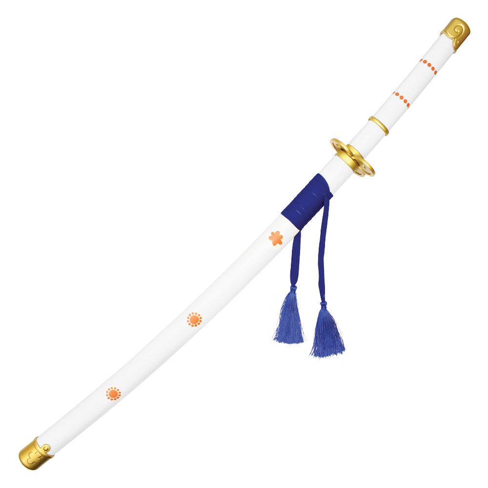 Wield the divine power of Kouzuki Oden with this incredible replica of the legendary "Ame No Habakiri" sword from One Piece. Known as one of the two swords used by Oden, this sword has the distinction of being able to "cut heavens" and is regarded as one of the most powerful blades in the series. This 37" replica faithfully recreates the original with a stunning 25.5" flaming steel blade, evoking the fierce energy of the sword. The 11.5" white and gold handle provides a balanced grip, while the elegant white saya, complete with blue tassels and orange emblems, ensures it stands out in any cosplay, collection, or display. Fans of Oden and One Piece will appreciate this detailed recreation of one of the most iconic weapons in the series.