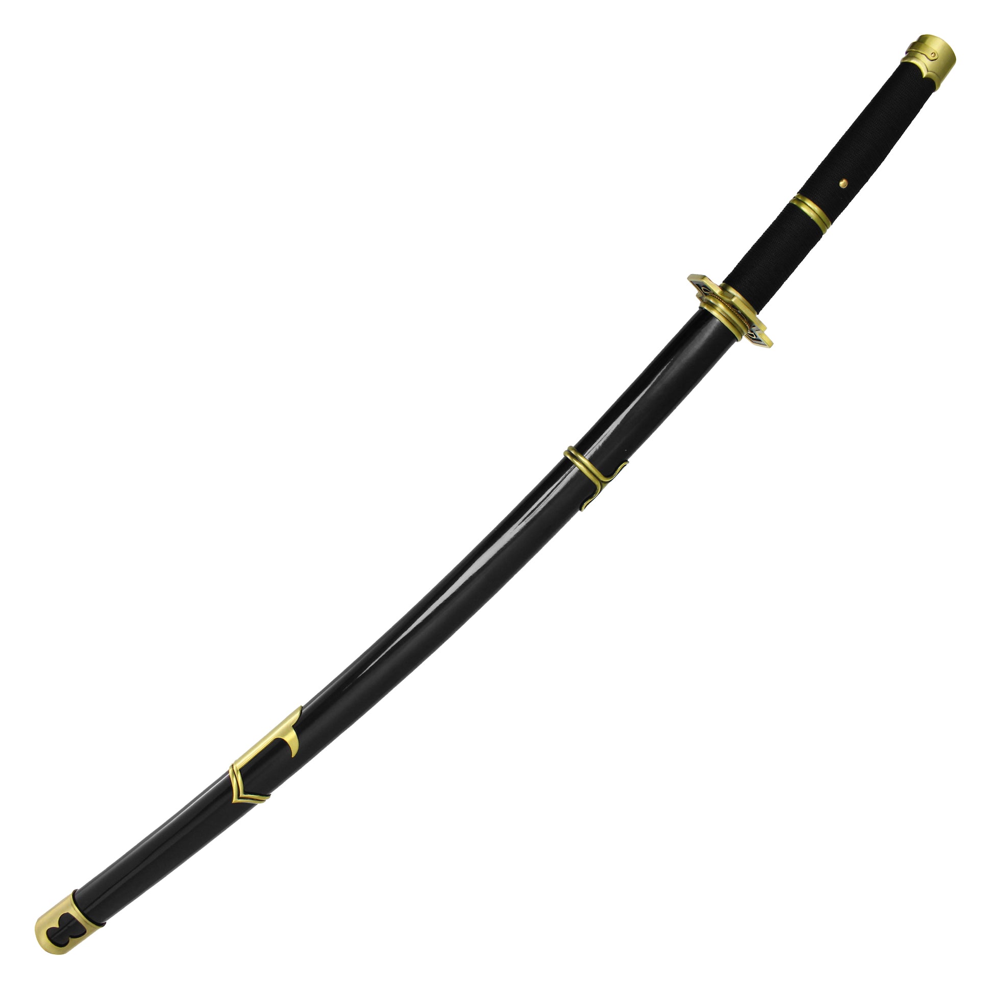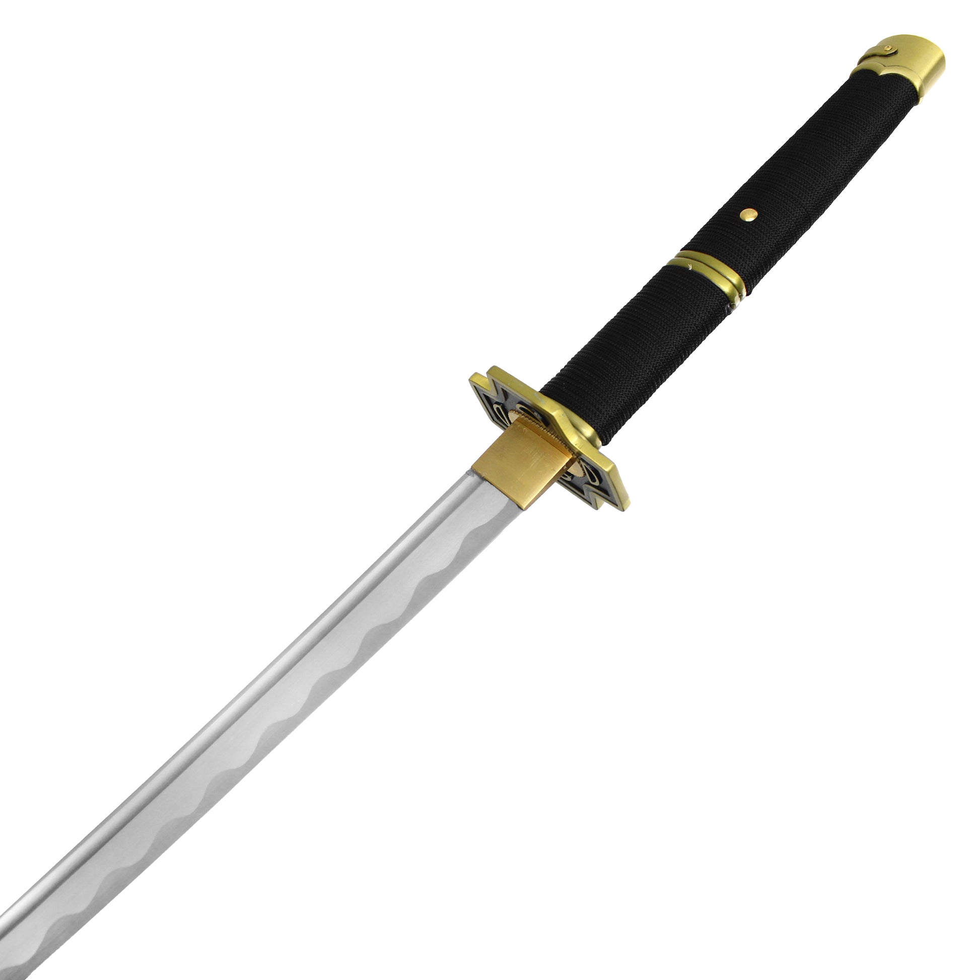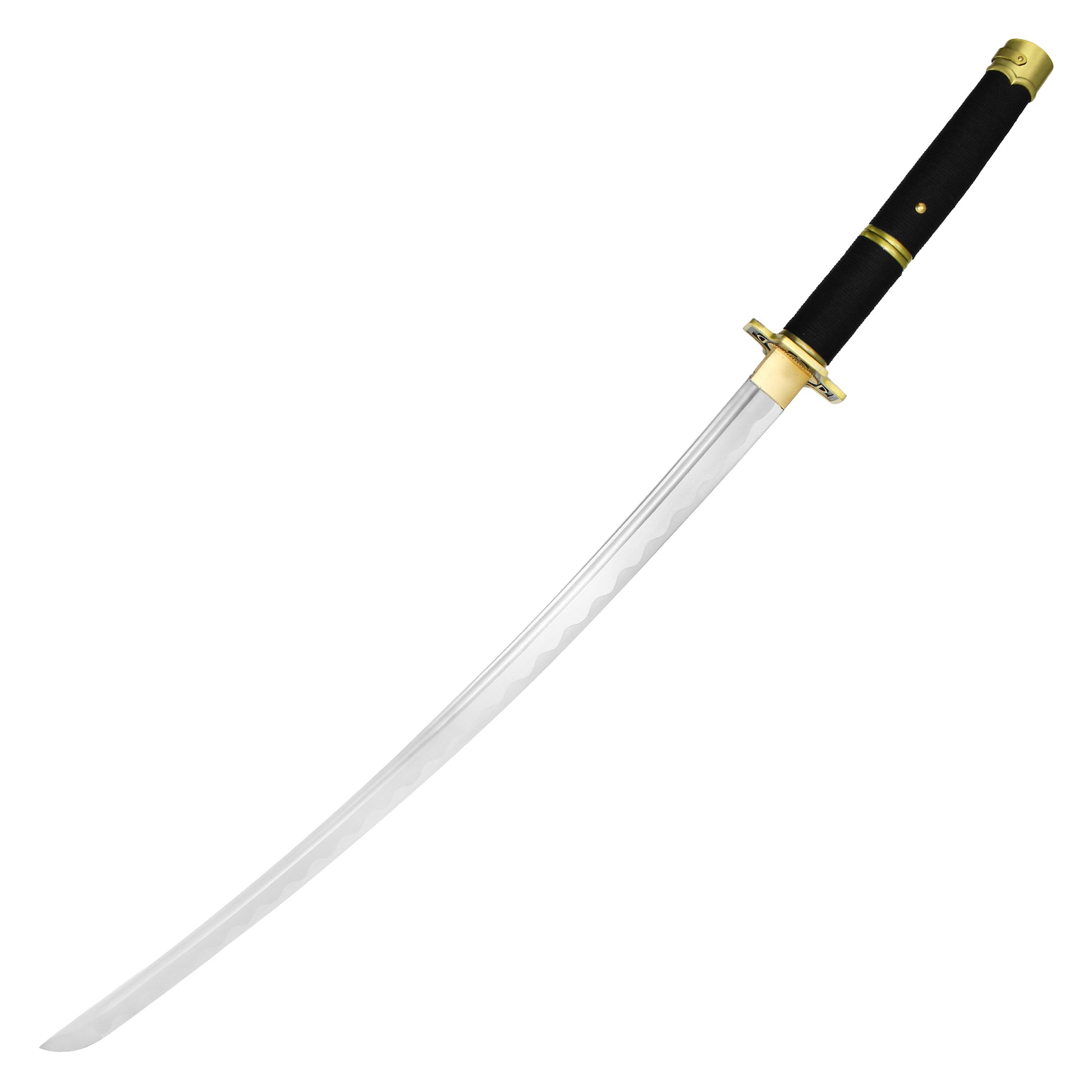 Wield the swift and legendary power of Yubashiri, one of Roronoa Zoro's iconic swords from the One Piece anime and manga series. This hand-forged replica boasts a 27.5" carbon steel blade, known for its durability and sharpness, making it an excellent addition to any collection. The 12" black wrapped handle with brass accents ensures a solid grip while reflecting the elegance and strength of Zoro’s technique. The sleek black saya completes the look, making this sword perfect for display or cosplay. Yubashiri was gifted to Zoro during his adventures and became one of his trusted weapons, until its destruction at Enies Lobby. This high-quality replica captures the spirit and craftsmanship of the original, perfect for any fan of the One Piece universe.