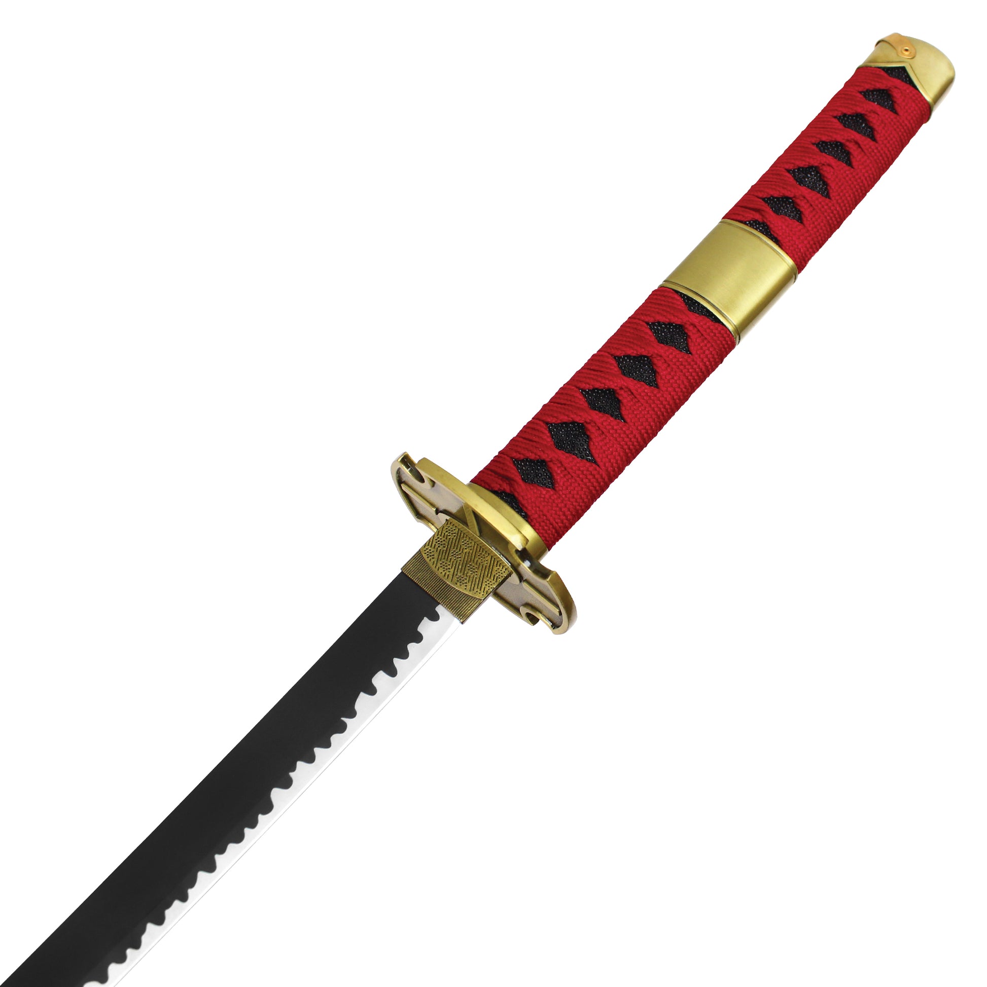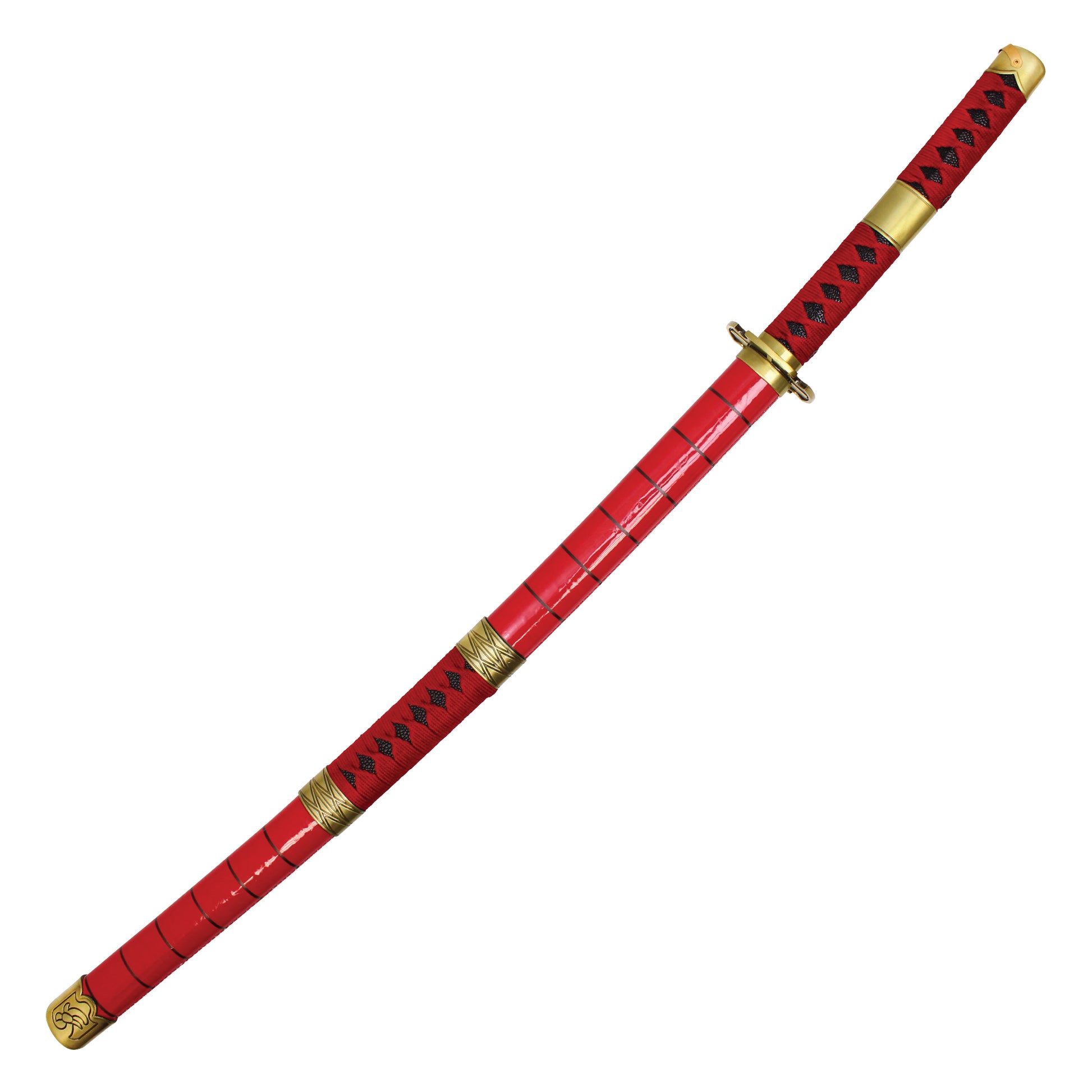 Unleash the cursed power of the "Sandai Kitetsu," one of Roronoa Zoro’s legendary swords from One Piece. Known for its sharp edge and dangerous history, this sword is one of the cursed Kitetsu blades, wielded by Zoro despite its ill-fated legacy. This 40" steel replica features a 27" patterned steel blade, capturing the dangerous allure of the original. The 11" red and gold-wrapped handle provides an authentic touch, while the red striped saya adds a bold finish to the sword’s design. Perfect for cosplay, collection, or display, this piece of Zoro’s iconic sword collection is a must-have for One Piece fans who want to wield the power of the Sandai Kitetsu.