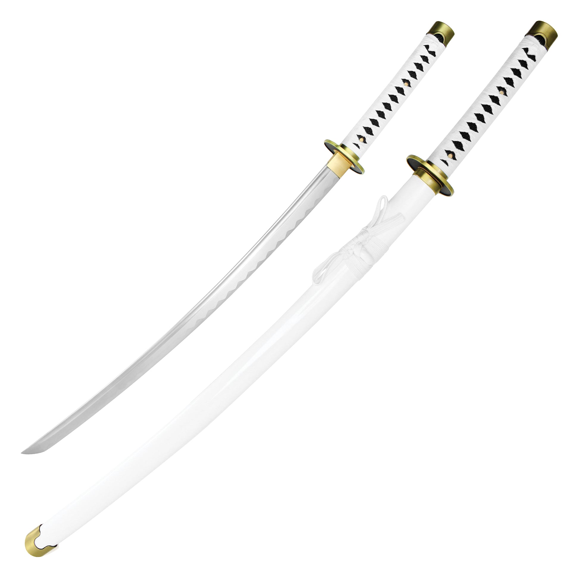 The legendary "Wado Ichimonji" is one of Roronoa Zoro's most prized swords from One Piece and is known for its pristine white design and immense strength. As one of the 21 O Wazamono grade swords, this katana has a rich history, having originally belonged to Kuina before Zoro inherited it. This 39.5" replica faithfully mirrors the original with a 27.5" hand-forged carbon steel blade, capturing the elegance and precision of this renowned weapon. The 12" white-wrapped handle with brass accents provides an authentic grip, while the matching white saya completes the iconic look. Perfect for cosplay, collection, or display, this replica is a must-have for any One Piece fan.