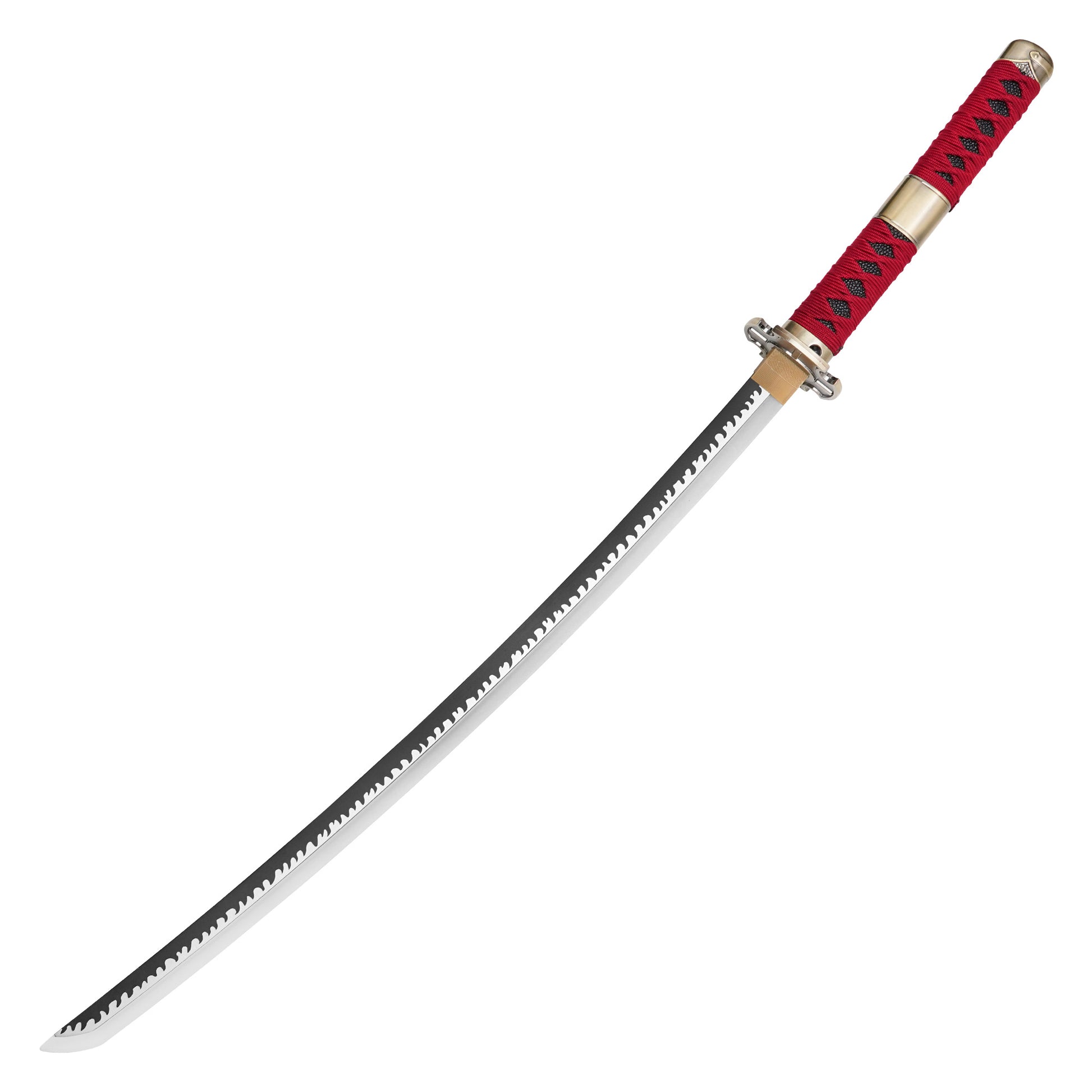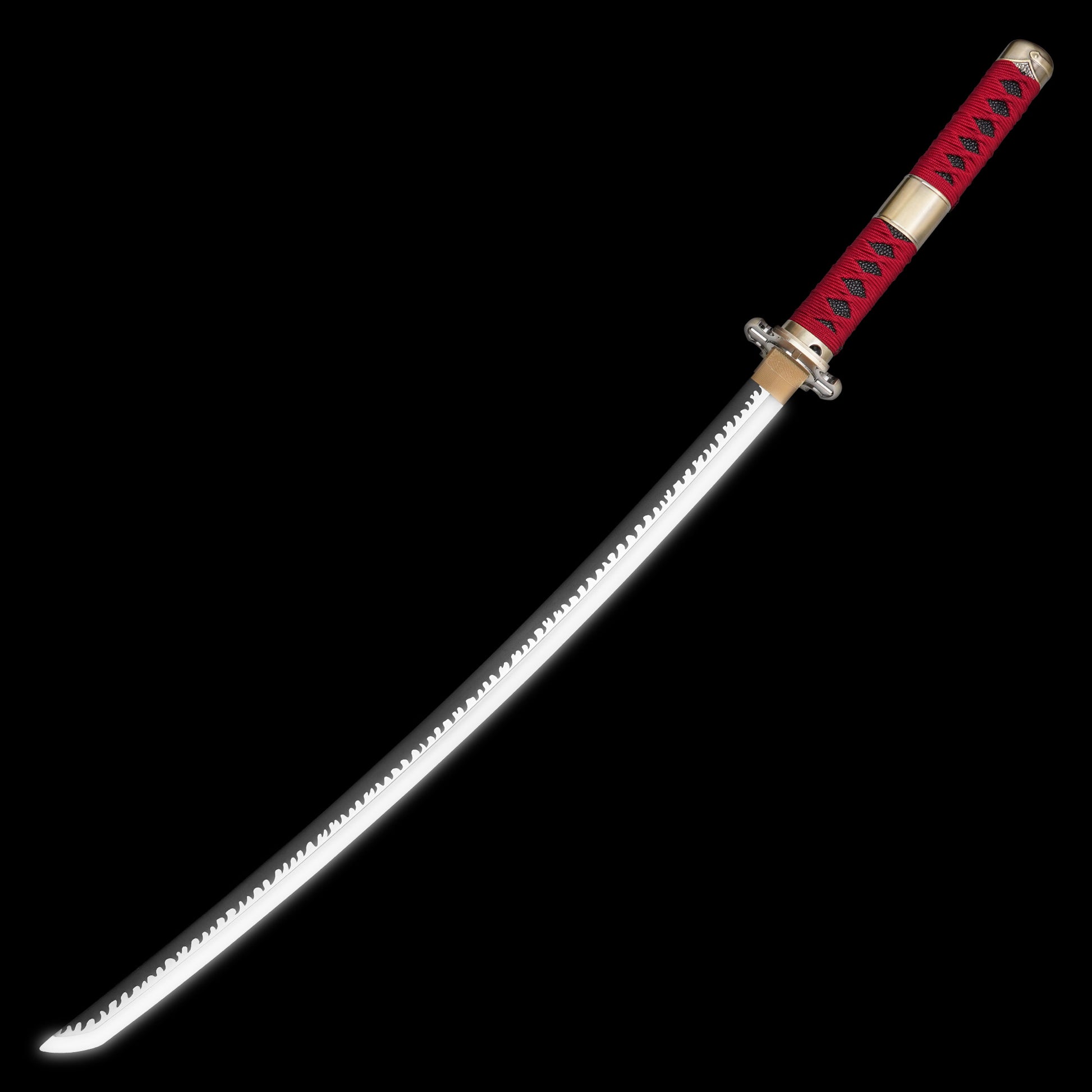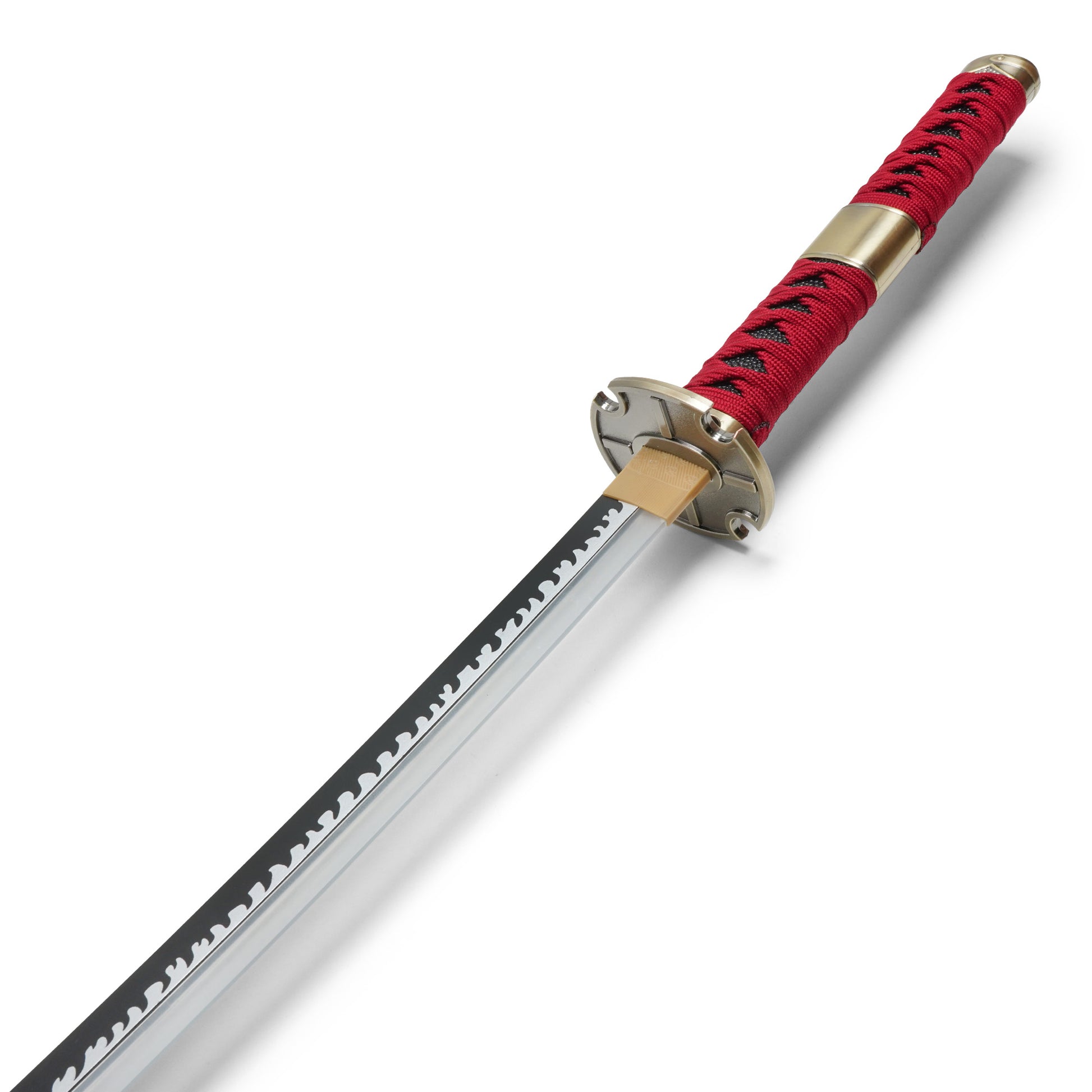 Embrace the cursed power of Sandai Kitetsu, one of Roronoa Zoro’s legendary swords from One Piece, now reimagined as a glowing LED replica. This 38.5” katana features a brilliant white LED blade, illuminating its infamous serrated hamon pattern in stunning detail. The 27” plastic blade glows brightly, making it perfect for cosplay and display, while the 11.5” red-wrapped handle provides an authentic grip. Encased in a matching red scabbard with a detailed red wrap, this lightweight yet striking replica is ideal for conventions, collections, or adding an electrifying presence to any One Piece display. Whether wielding it in battle poses or showcasing its eerie glow, this Sandai Kitetsu LED sword is a must-have for true fans of Zoro’s cursed blade collection.