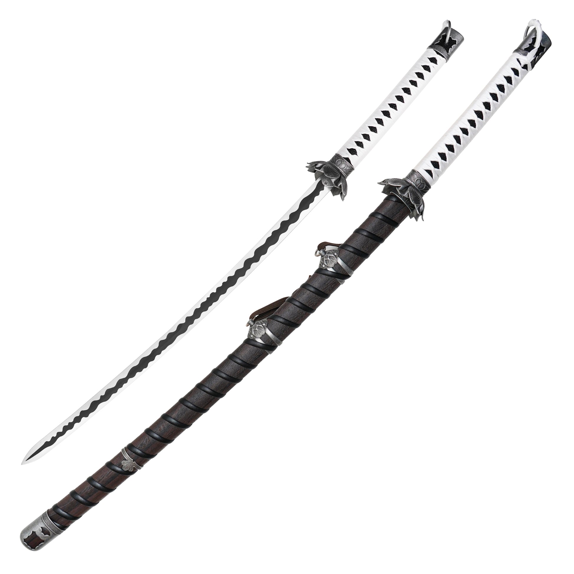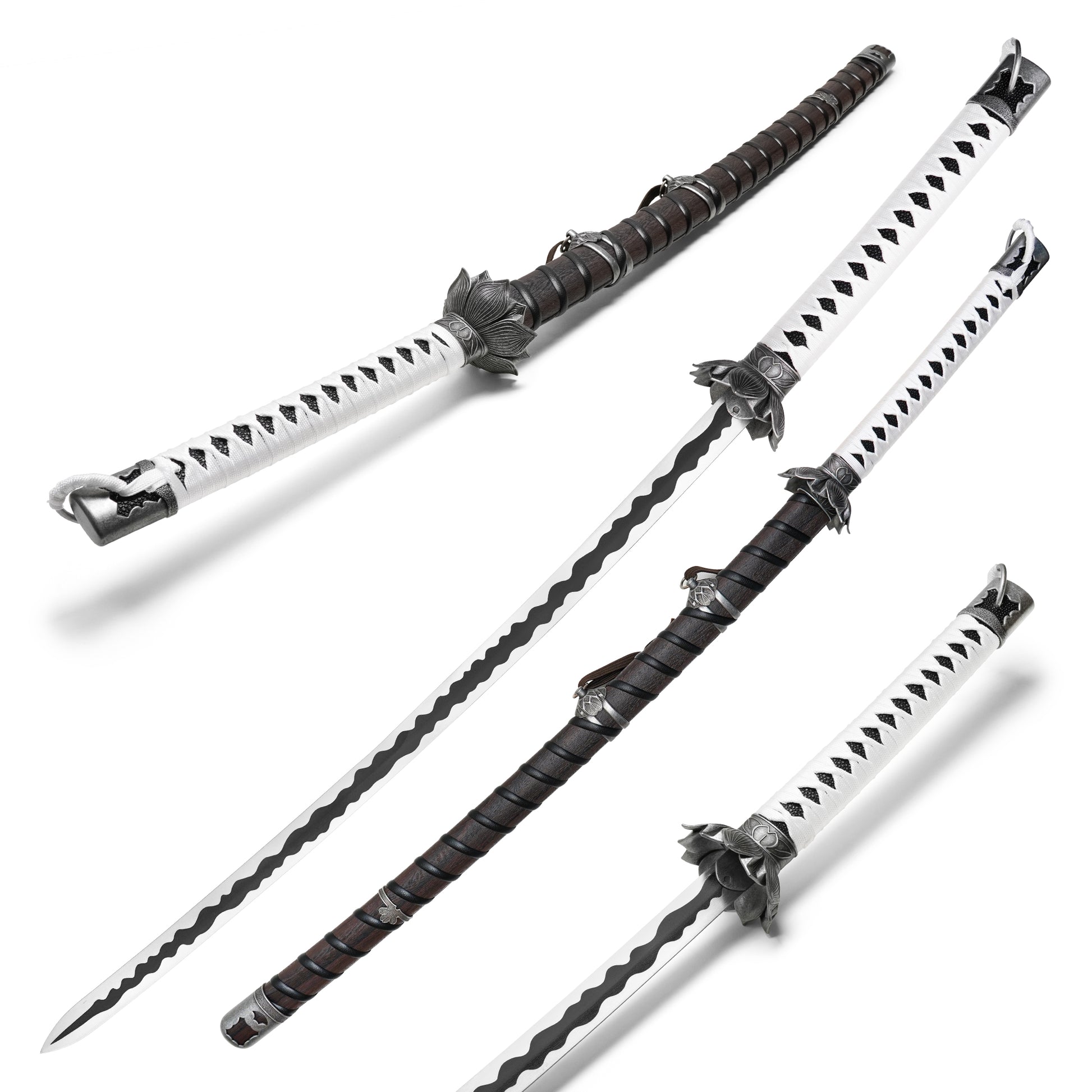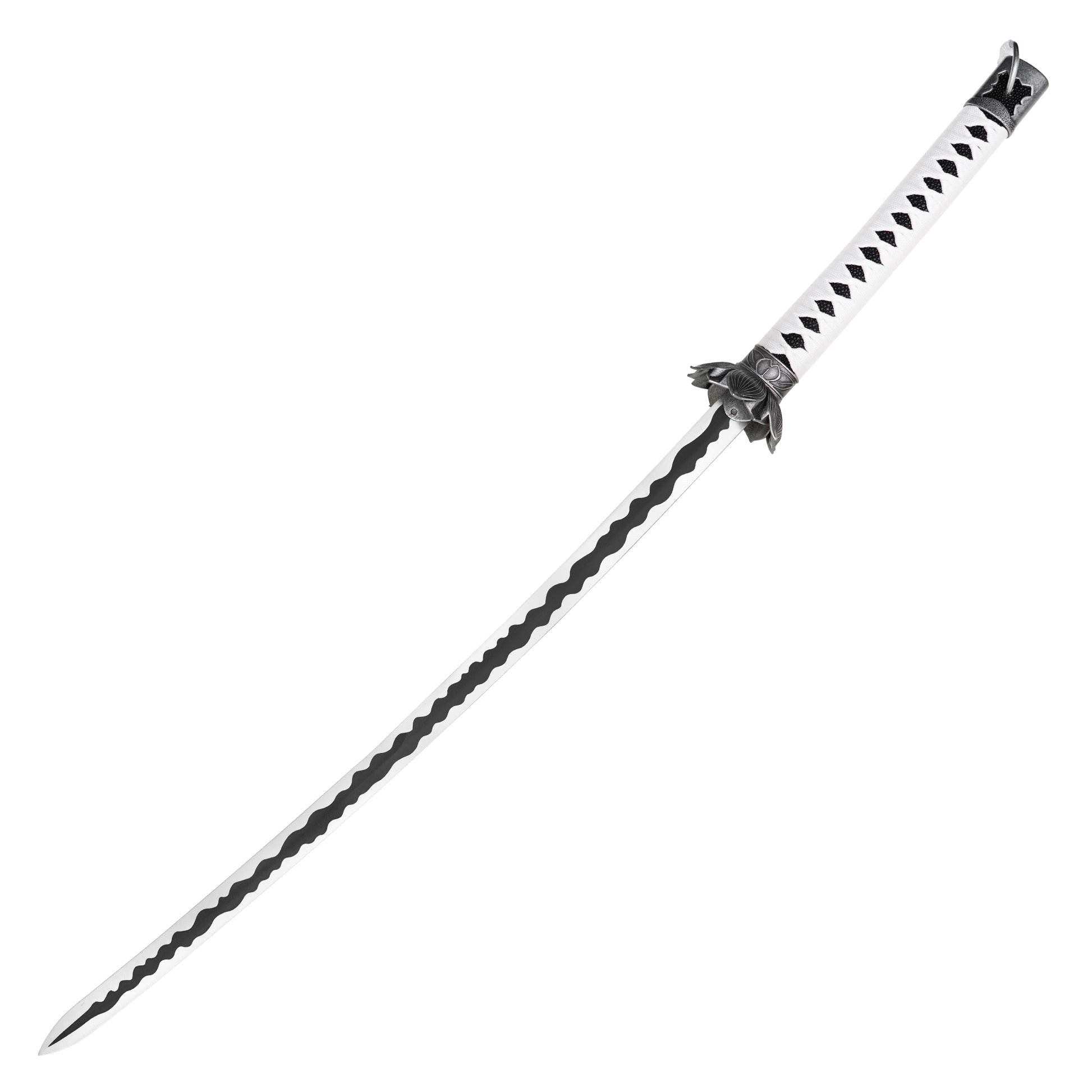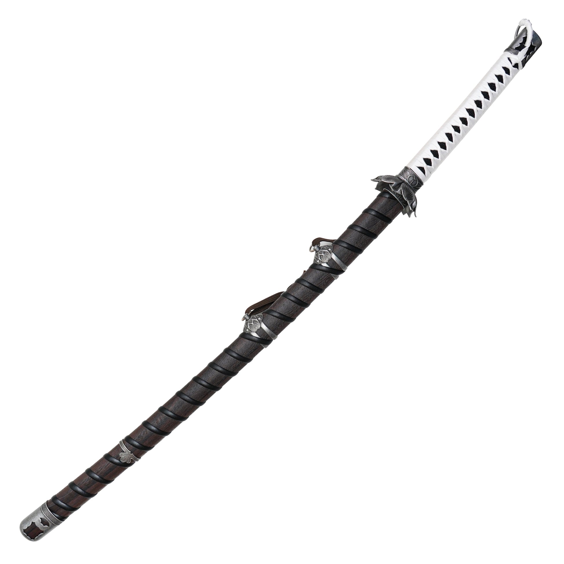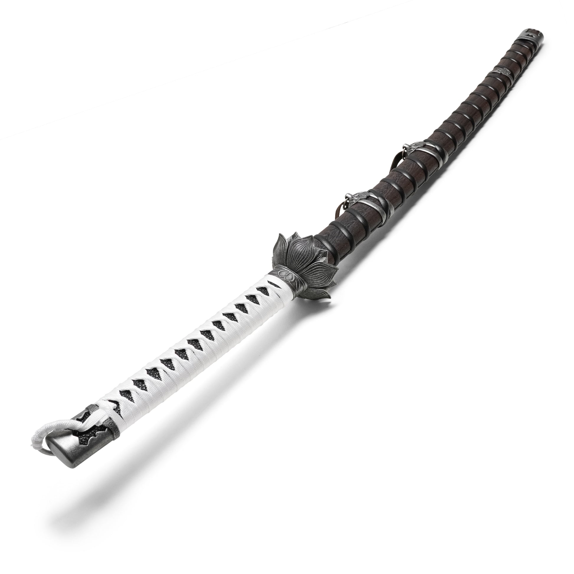 Unleash the power of Sekiro's Black Mortal Blade, a faithful replica from the critically acclaimed game Sekiro: Shadows Die Twice. This intricately crafted 38.5" sword features a 26" 2-tone print steel blade, capturing the deadly elegance of the weapon used by Sekiro in his battles. The 12.5" handle is wrapped in black and white for a striking contrast, providing a secure grip for cosplay or display. The blade comes housed in a dark brown textured saya, completing its authentic appearance. Ideal for Sekiro fans and collectors, this replica perfectly balances between aesthetics and functionality, making it a must-have for any serious enthusiast.