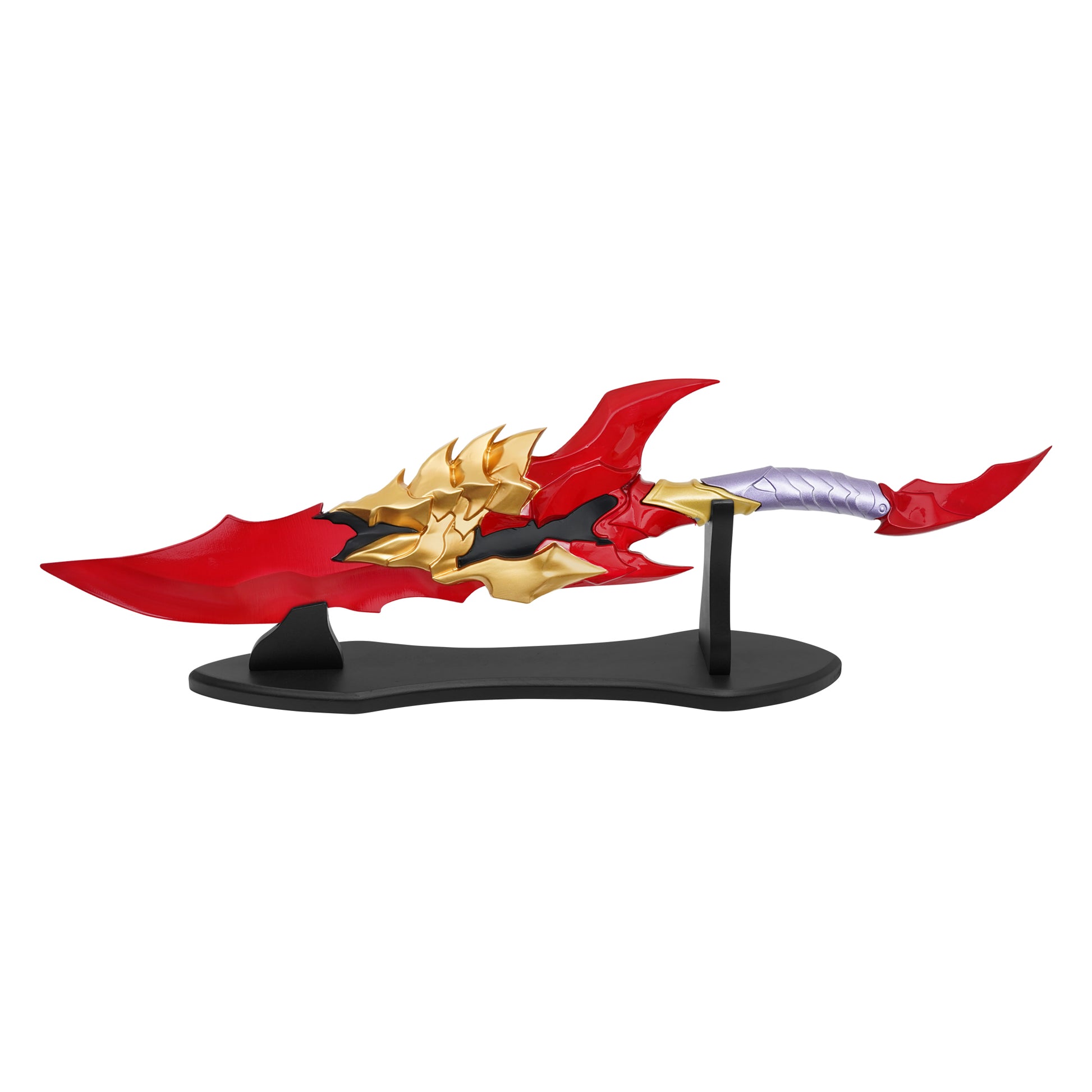 Unleash the fiery power of Kamish’s Wrath Dagger, one of the legendary twin blades wielded by Sung Jin-Woo in Solo Leveling. Forged from the remains of Kamish, the mighty dragon, this weapon is steeped in lore as a symbol of Jin-Woo’s rise to unmatched strength. This replica captures every fierce detail with a 10.5" bright red metal blade, highlighted by its jagged, flame-like design and a 13" sculpted metal handle with gold accents and intricate guard work. Measuring 23.5” overall, this steel dagger perfectly reflects the destructive aura of the original artifact. Designed for cosplay, collection, or display, it includes a black wood display stand, making it an essential centerpiece for Solo Leveling fans and anime weapon collectors alike.