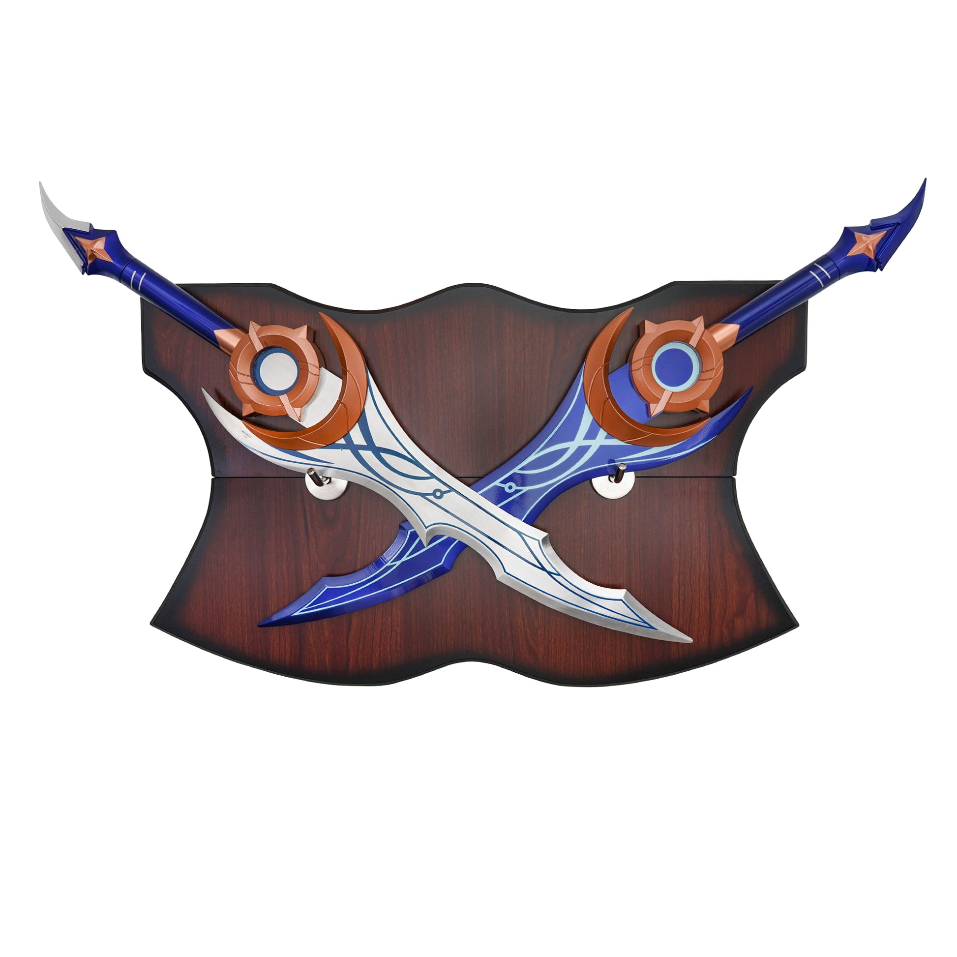 Channel the balanced elegance of Sung Jin-Woo’s dual mastery with the Moonshadow 2-Piece Dagger Set, a stunning steel replica set from Solo Leveling. Representing the harmony between light and darkness, these ceremonial-style daggers embody the evolution of Jin-Woo’s strength and precision. Both the Light Moonshadow and Dark Moonshadow daggers measure 27.5 inches, crafted with stylized blue steel blades and intricate silver linework, accented by metallic bronze guards and uniquely sculpted hilts. Though unsharpened, these steel replicas offer premium detail and presence. Mounted on a 23.5" x 14.5" custom wooden display plaque, this set makes the perfect centerpiece for fans and collectors alike—ideal for cosplay, fantasy-themed decor, or any Solo Leveling weapon wall.