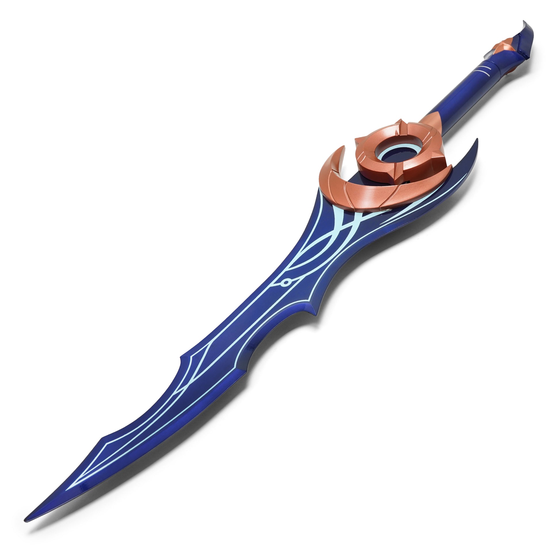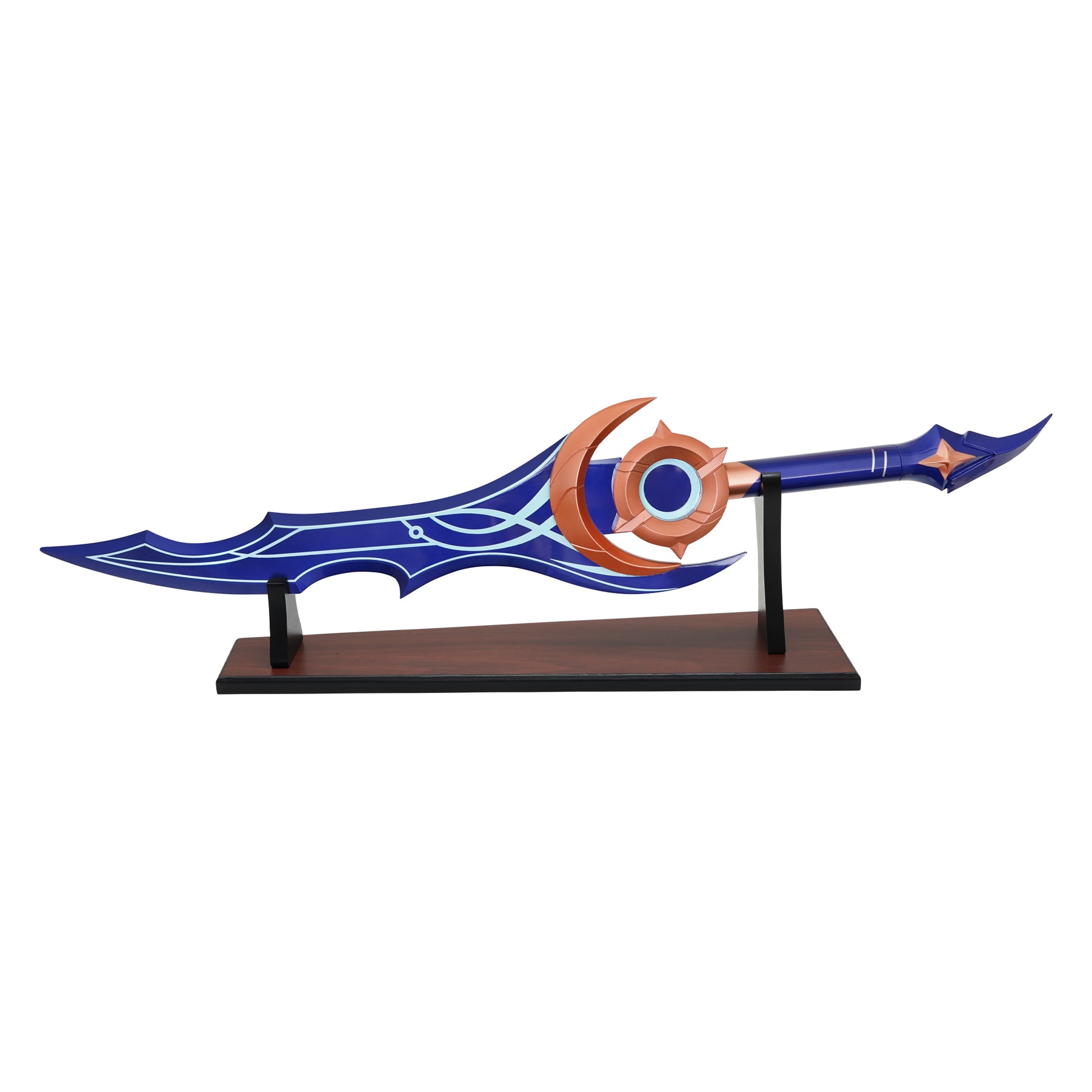 Step into the shadows with the Moonshadow Dagger (Dark Form), a beautifully crafted steel replica from Solo Leveling. Wielded by Sung Jin-Woo in his evolved state, this dagger represents the refined power and mystic balance of the Shadow Monarch’s arsenal. Measuring 27.5 inches, it features a 19.25-inch deep blue steel blade adorned with elegant arcane-style detailing and flowing contours. The 13.5-inch matching blue handle is accented by a bold bronze crescent guard, merging elegance with lethality. Complete with a brown wood display stand, this dagger is perfect for cosplay, fantasy-themed decor, or as a centerpiece in any Solo Leveling weapon collection.