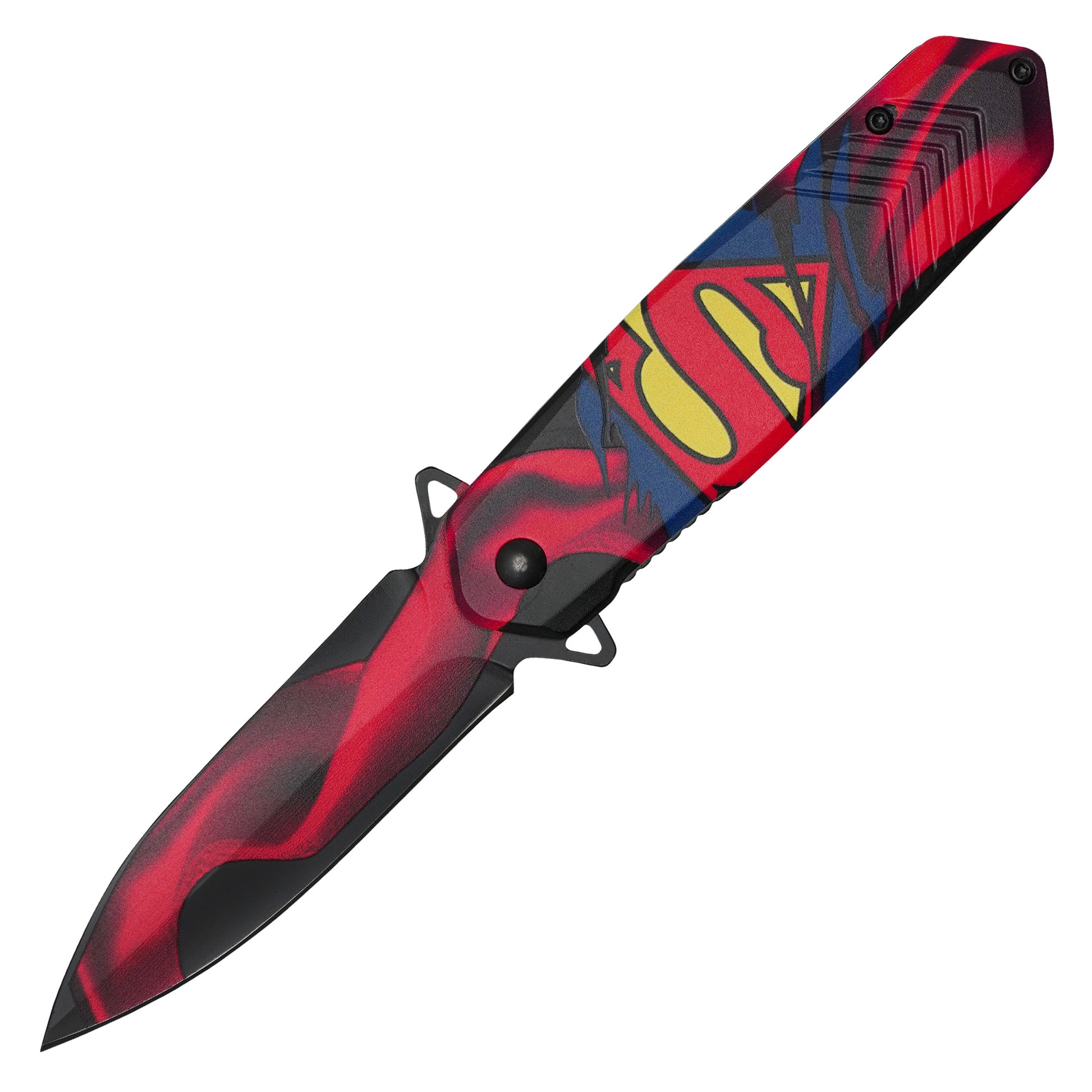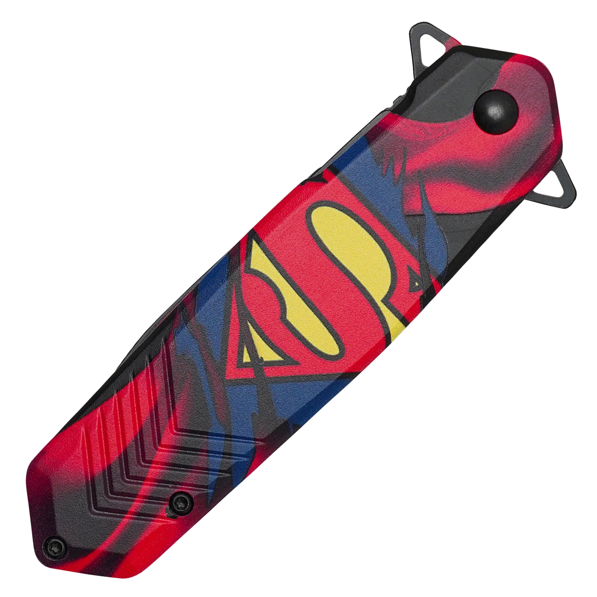 The Superman - Crest Edition Spring Assisted Pocket Knife is a bold tribute to the iconic Man of Steel. Featuring a 3.5" dark graphic stainless steel blade and a 4.5" handle emblazoned with Superman’s classic yellow-and-red “S” crest, this knife captures the strength and symbolism of the hero himself. The high-contrast red and blue colorway gives it a striking comic-style aesthetic, while the spring assisted mechanism ensures smooth, reliable deployment. A belt clip is included for easy everyday carry. Ideal for Superman fans, collectors, and superhero enthusiasts alike.