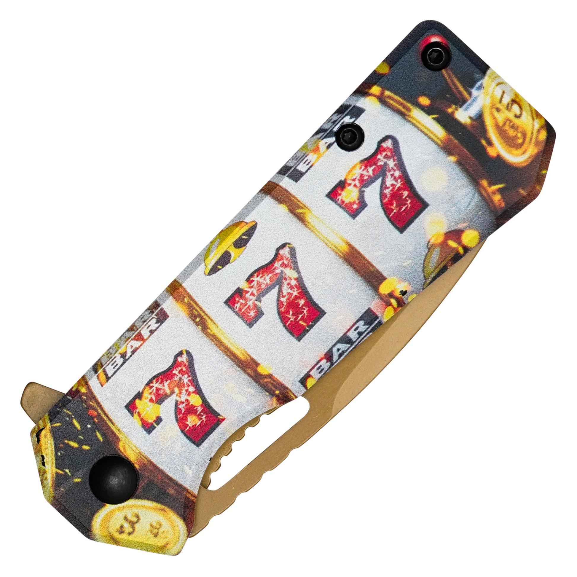 Hit the jackpot with the Gold Lucky 777 Spring Assisted Pocket Knife by Wartech, a bold blade designed for those who live life on a winning streak. This 6.25” compact carry knife features a 2.75" gold-finished stainless steel blade that deploys quickly and smoothly thanks to its spring assisted mechanism. The standout 3.5" handle is wrapped in a vibrant casino-inspired print featuring spinning 777 slot reels and golden coins, capturing the thrill of the jackpot in a unique everyday carry. With a built-in belt clip for secure portability, this flashy blade makes the perfect collectible or lucky charm for risk-takers and EDC enthusiasts alike.