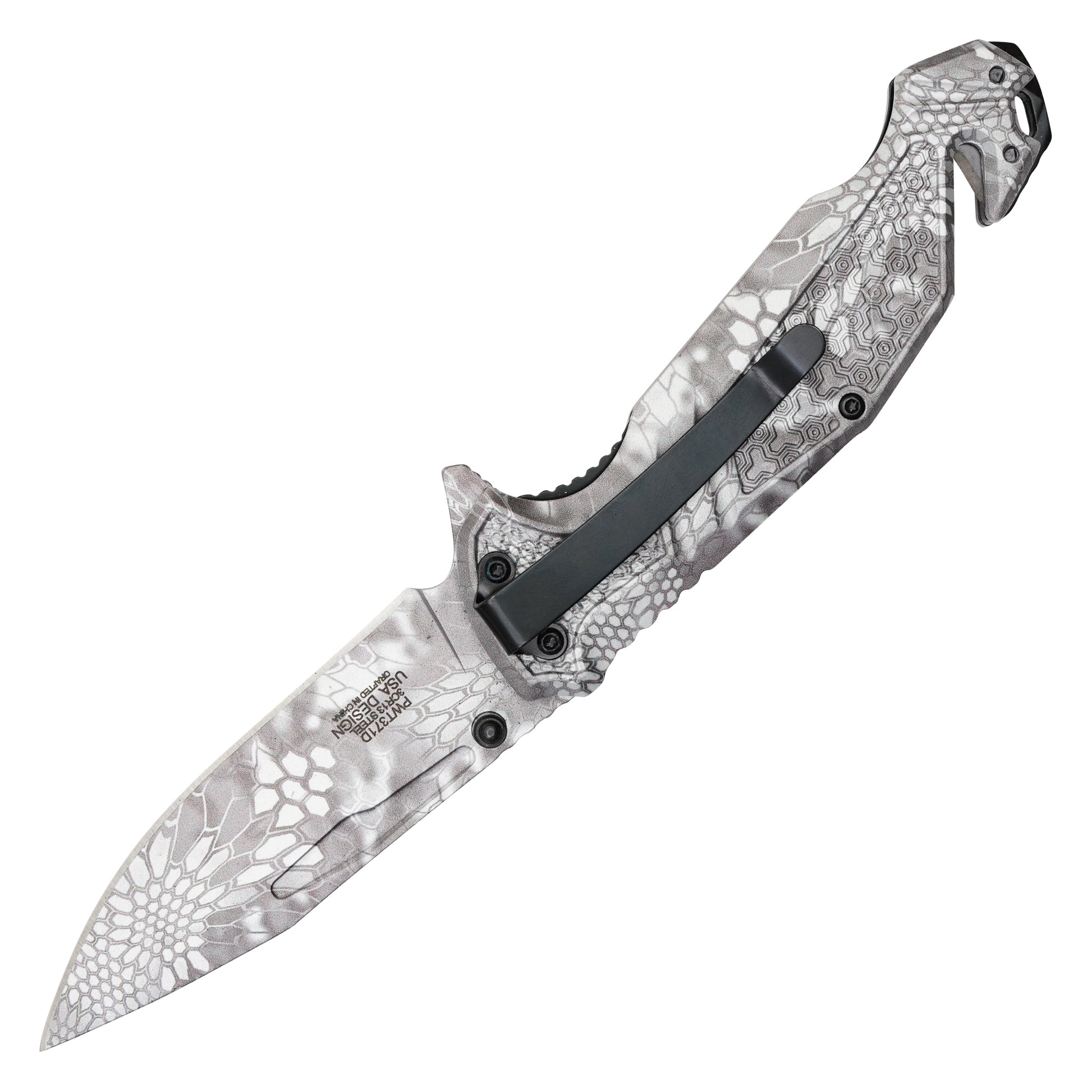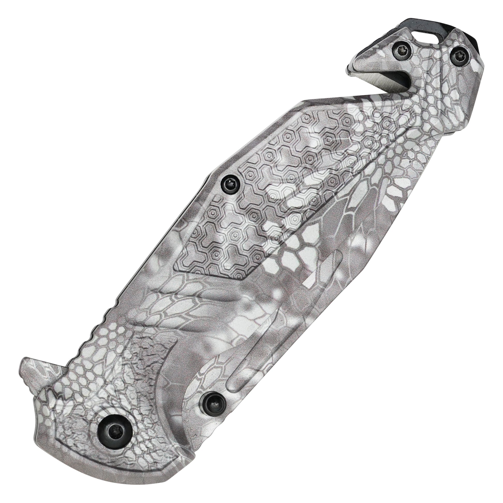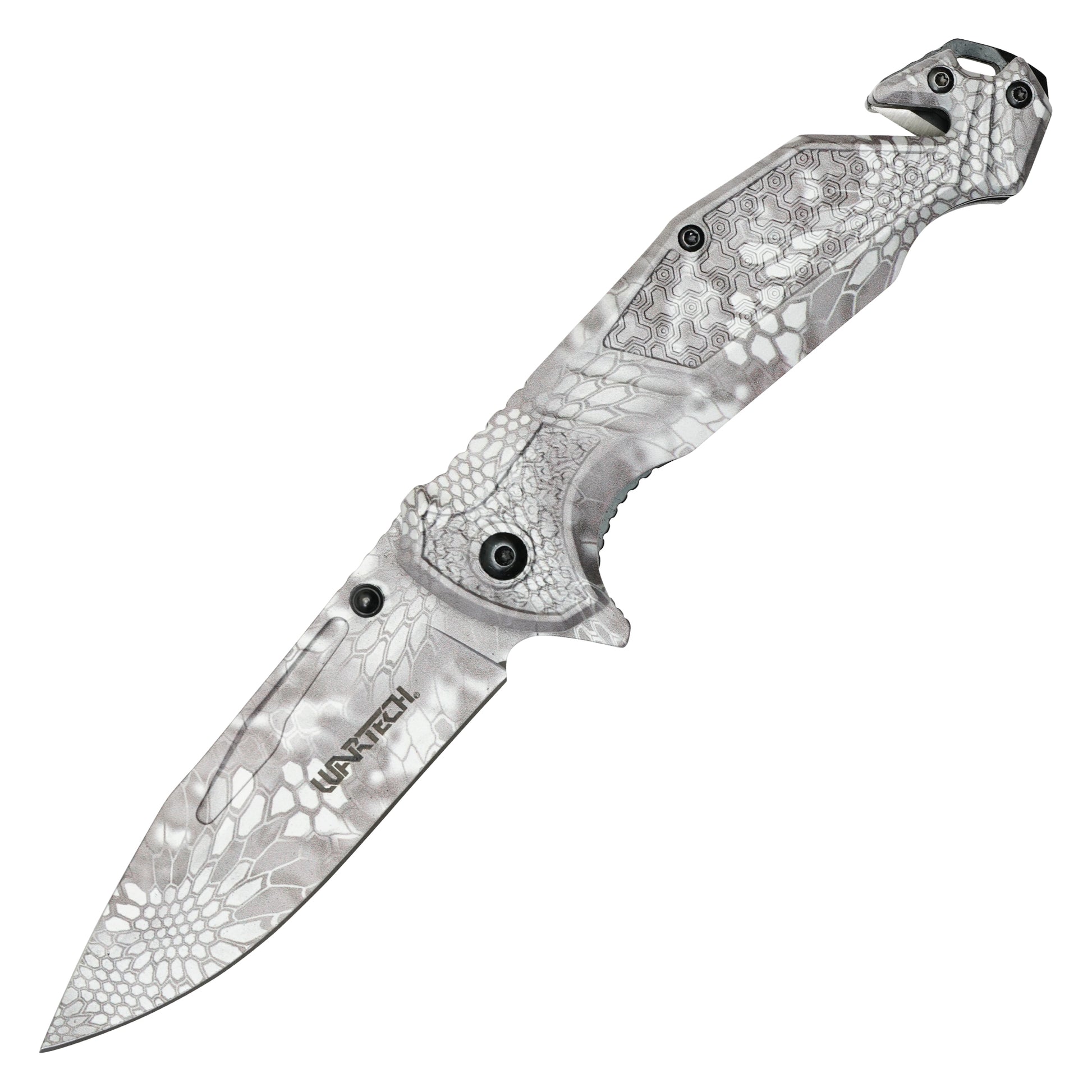 The Wartech 8.25" Frost Morpho Camo Spring Assisted Pocket Knife is engineered for rugged winter environments, making it an essential tactical tool for cold weather conditions. Equipped with a sharp 3.5" frost morpho steel blade, this knife excels in precision and durability, ensuring reliable performance in icy or challenging terrains. The 4.75" frost morpho camo print handle offers an ergonomic grip, even with gloves, while the integrated cord cutter and glass breaker enhance its versatility as an all-weather survival tool. Designed for those who need reliability in extreme cold, the Frost Morpho Camo is built to handle it all.