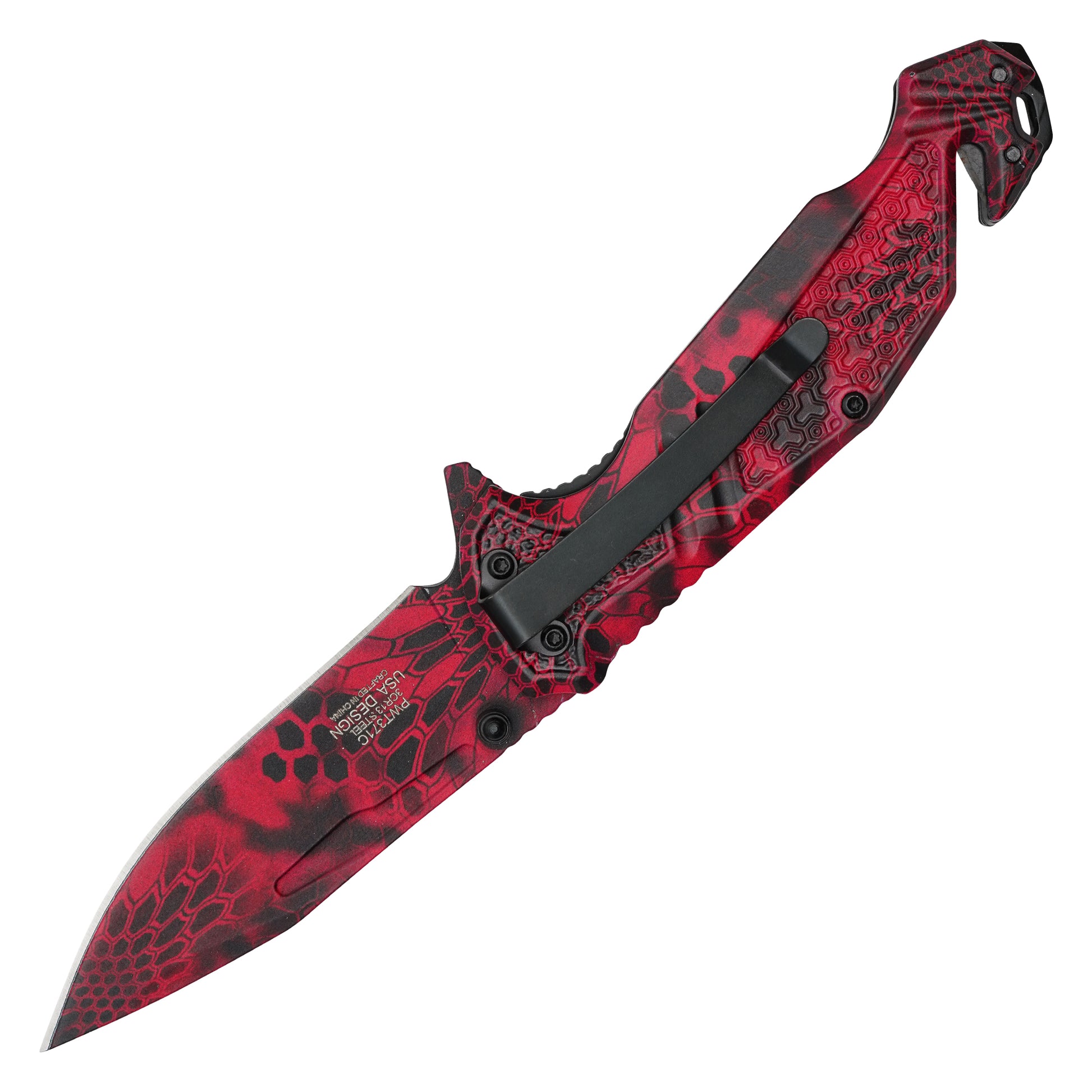 The Wartech 8.25" Red Morpho Camo Spring Assisted Pocket Knife is designed for tactical precision in demanding environments. With a striking 3.5" red morpho steel blade, this knife offers strength and sharpness for versatile field use. Its 4.75" red morpho camo print handle is built for a secure, ergonomic grip, making it a reliable companion in both survival situations and everyday tasks. Equipped with a cord cutter and glass breaker, this knife delivers quick utility in high-pressure scenarios, ensuring that you’re ready for any challenge the field throws your way.