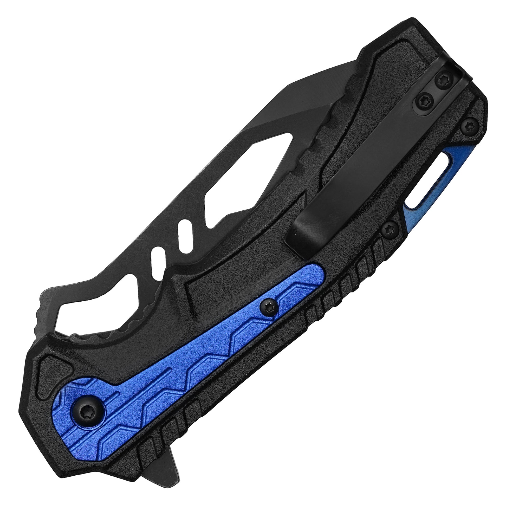 The Tactical Blue Spring Assisted Pocket Knife by Wartech is built for durability and fast action, making it a reliable choice for everyday carry and tactical use. Featuring a 3.5” perforated black steel blade, this knife delivers a sharp and rugged edge with a sleek modern design. The 4.75” black handle with blue accents offers an ergonomic grip, ensuring comfort and control in any situation. Designed for practicality, it includes a belt clip and lanyard hole, allowing for easy carry and accessibility. Whether for outdoor tasks, collection, or self-defense, this knife combines style with performance.